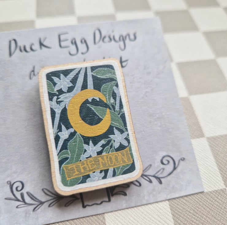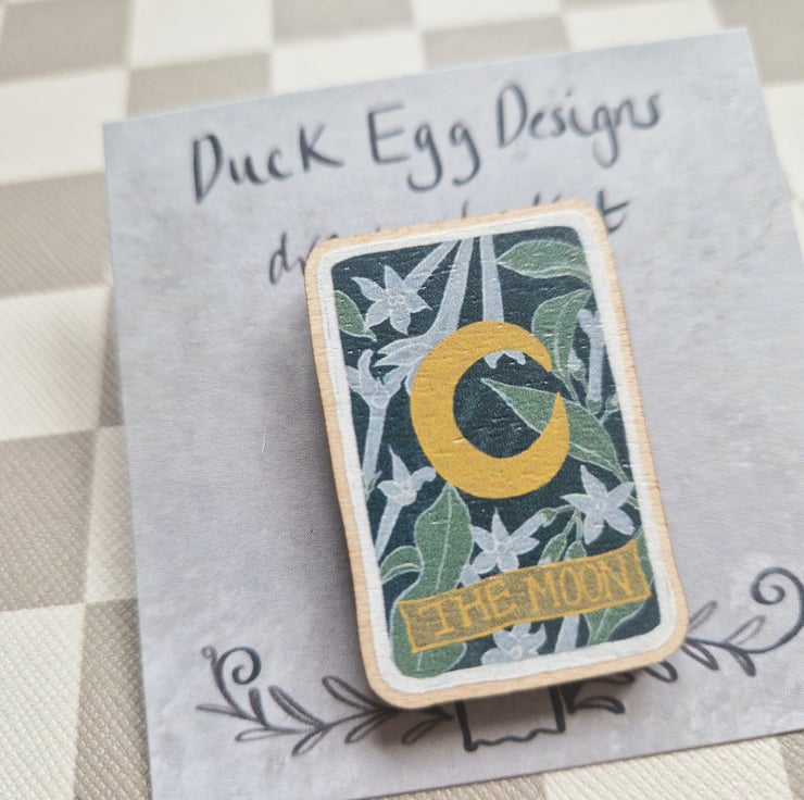 Moon tarot pin badge illustrated by me and made in the UK using FSC certified wood.