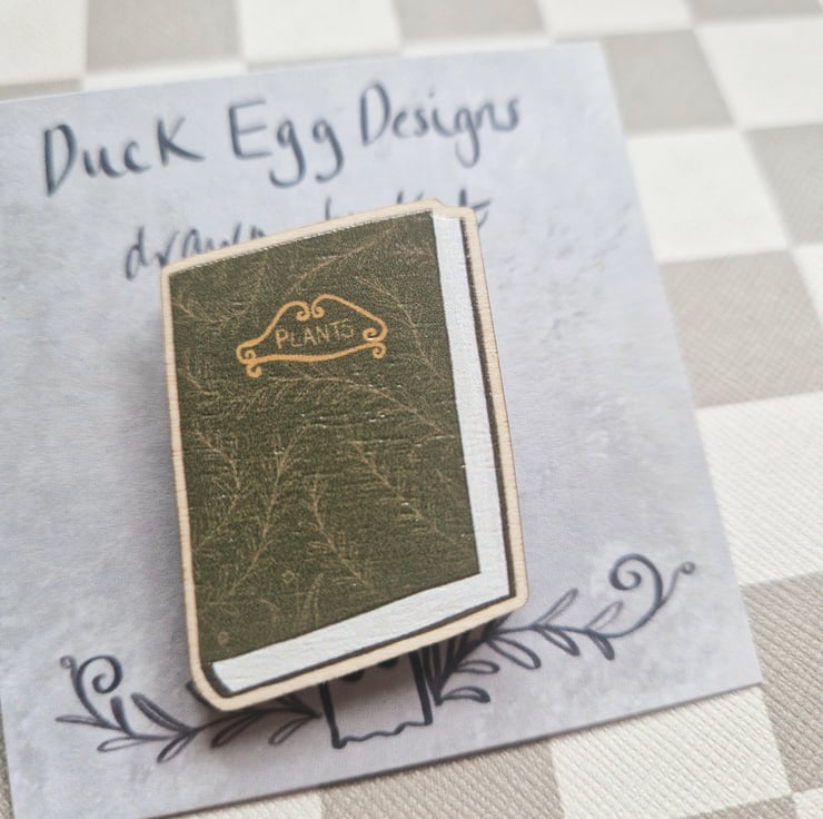 Green book pin badge illustrated by me and made in the UK using FSC certified wood.