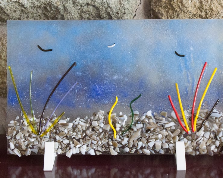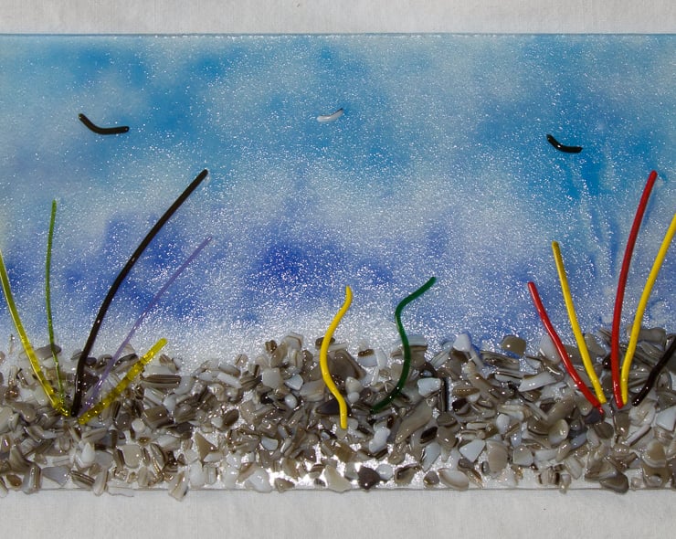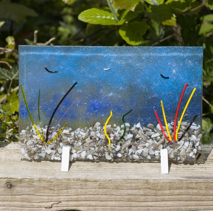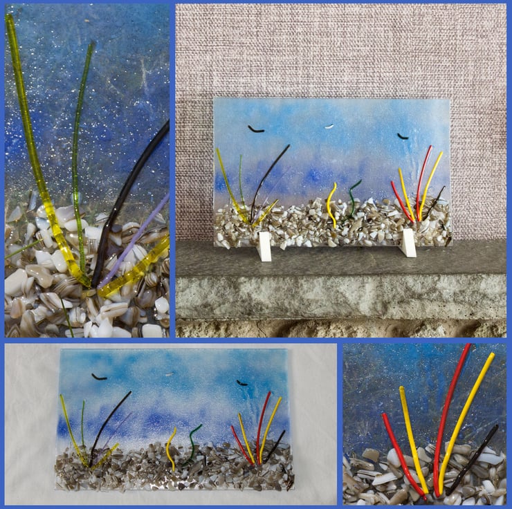 The sea bed has a stoney effect and stands out from the background, as do the reeds. Included are a pair of stands that allow the piece to be displayed on a shelf, window ledge or mantlepiece..
