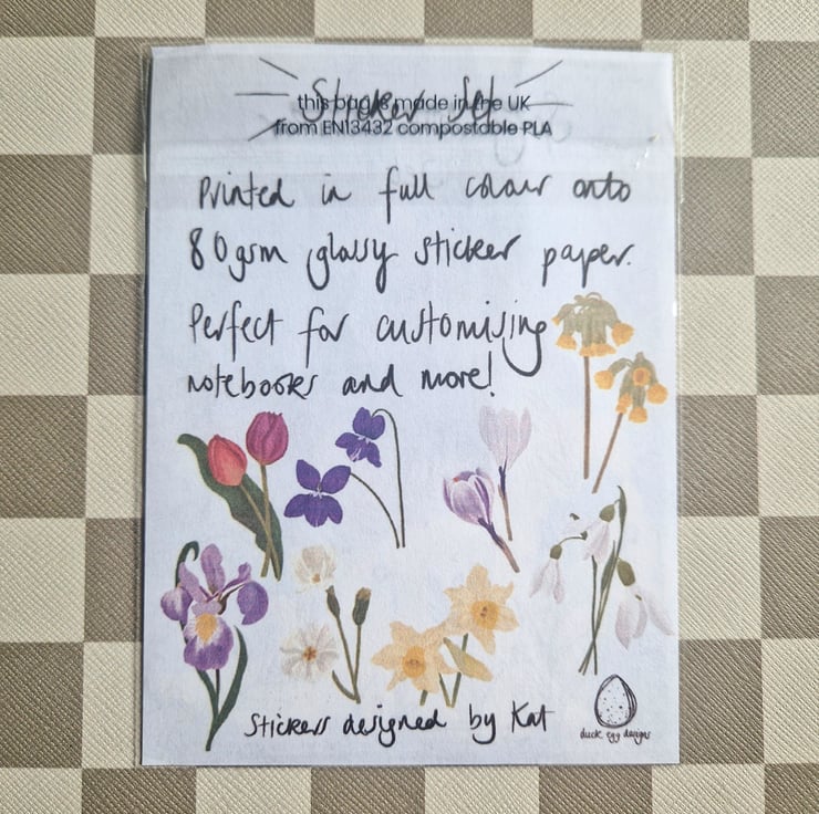 Spring flowers sticker set illustrated by me and made in the UK. Made in my little studio using 80gsm glossy sticker paper, each set contains eight different stickers.