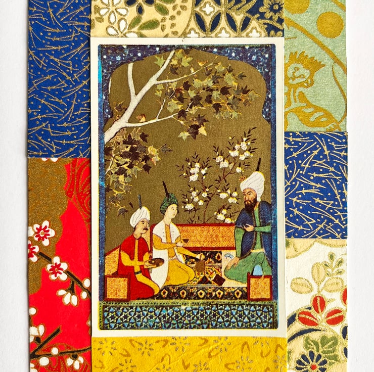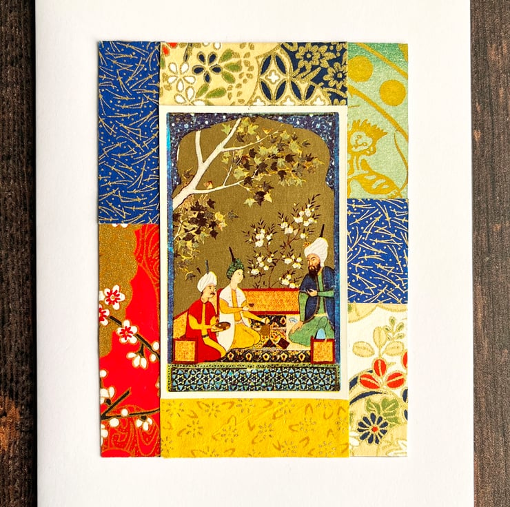 These colourful cards feature small collages with a vintage playing card at the centre and bordered with a selection of decorative papers from old books and origami papers.