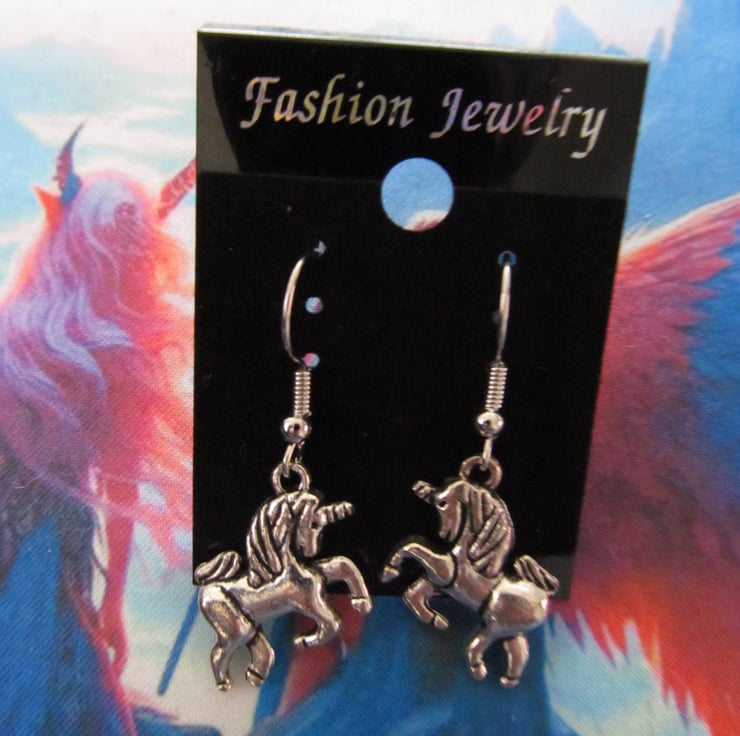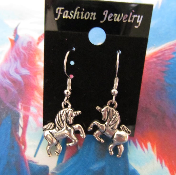 These unicorn earrings are fashioned with antique silver tone metal alloy and are presented on a black earring card. They are light and easy to wear and come within a gift bag so if not for yourself, would make a lovely gift.