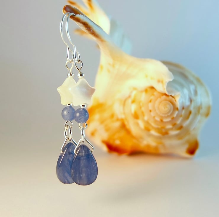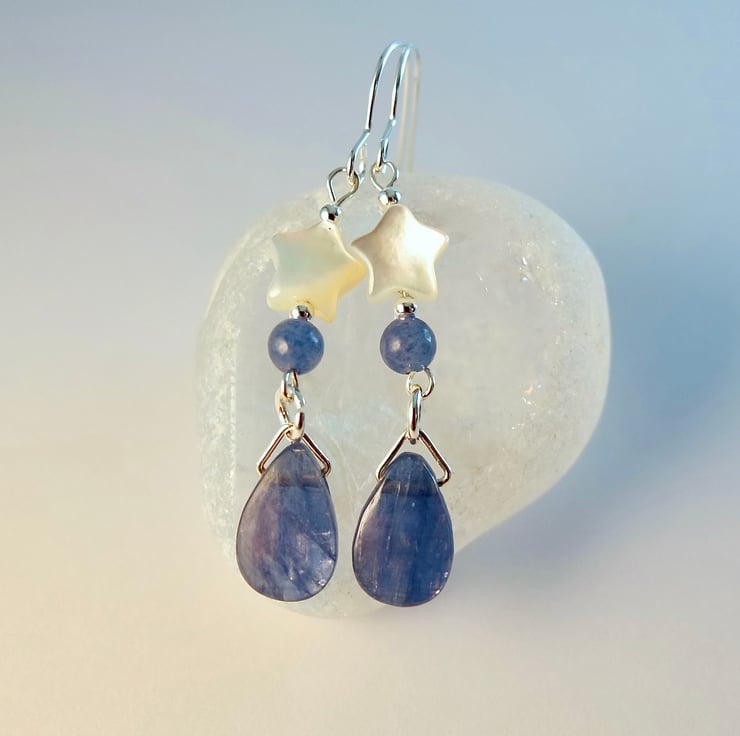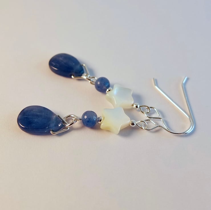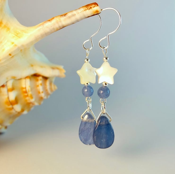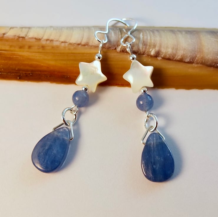 Each earring features a 12mm Kyanite teardrop, topped with a 4mm blue Aventurine bead and an 8mm iridescent Mother of Pearl star.