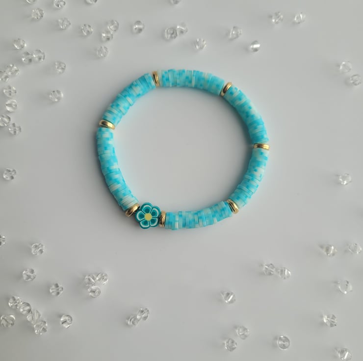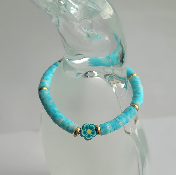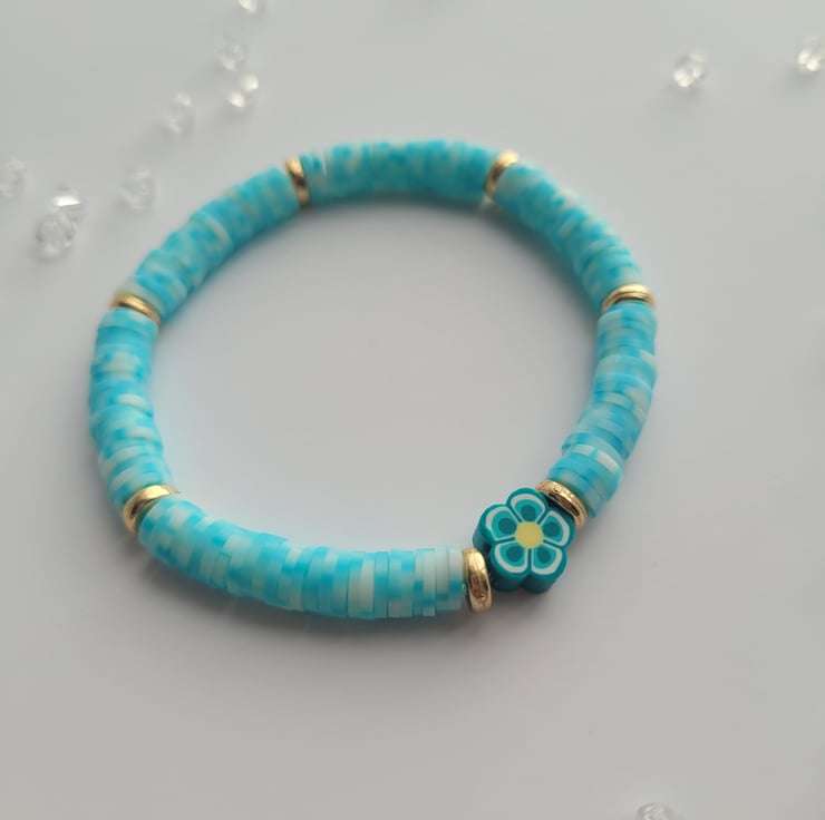 Unique handmade bracelet made from blue/white flat polymer clay beads, gold spacer beads, coordinating floral polymer clay bead and clear elastic cord.