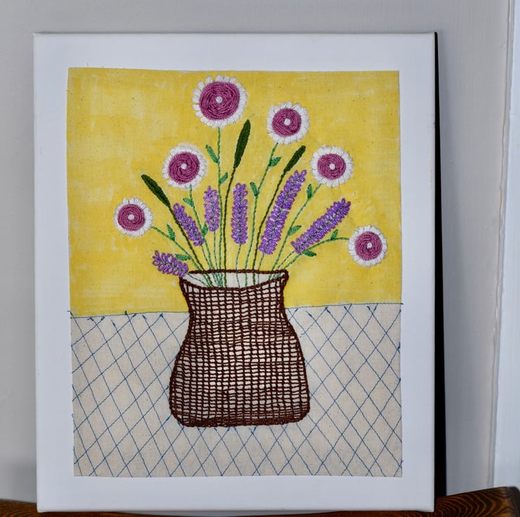 This lovely bunch of flowers & wicker vase have been created with hand embroidery and the table cloth with a sewing machine. The background has been painted with pro brush markers. The picture has been sewn onto a piece of cream calico and measures 25.5 cm x 20.4 cm. This picture has then been mounted on a white canvas board to create a finished piece measuring 29.5 cm x 25 cm. The flowers can be hung as is or framed further.