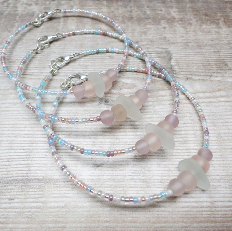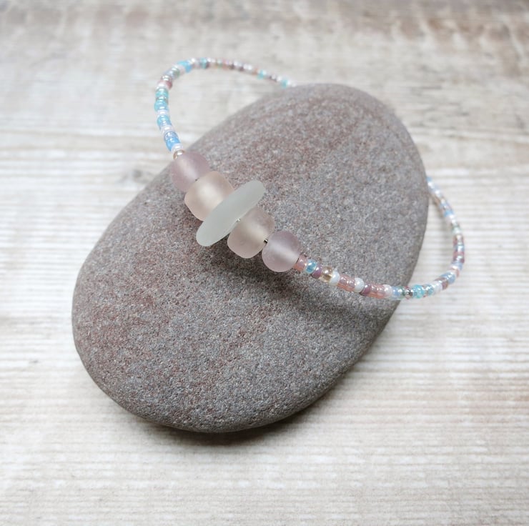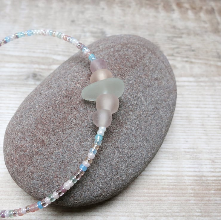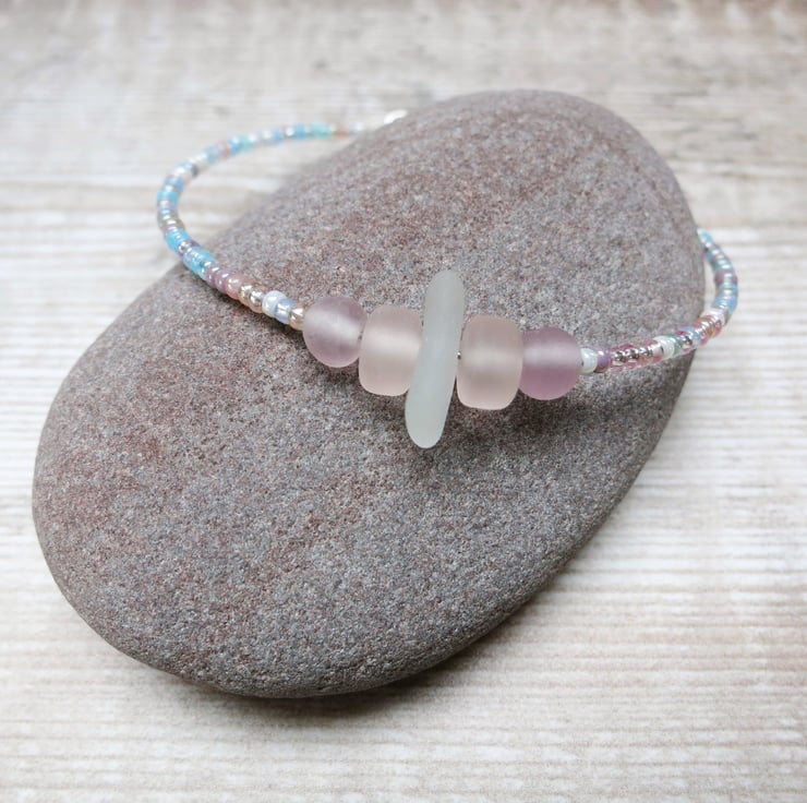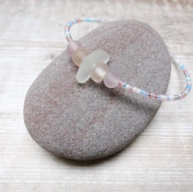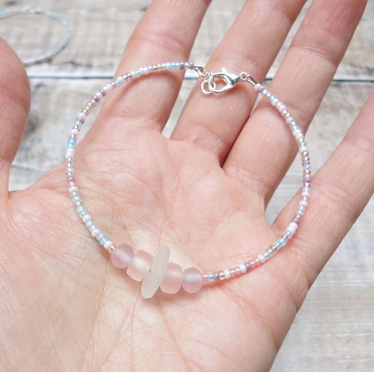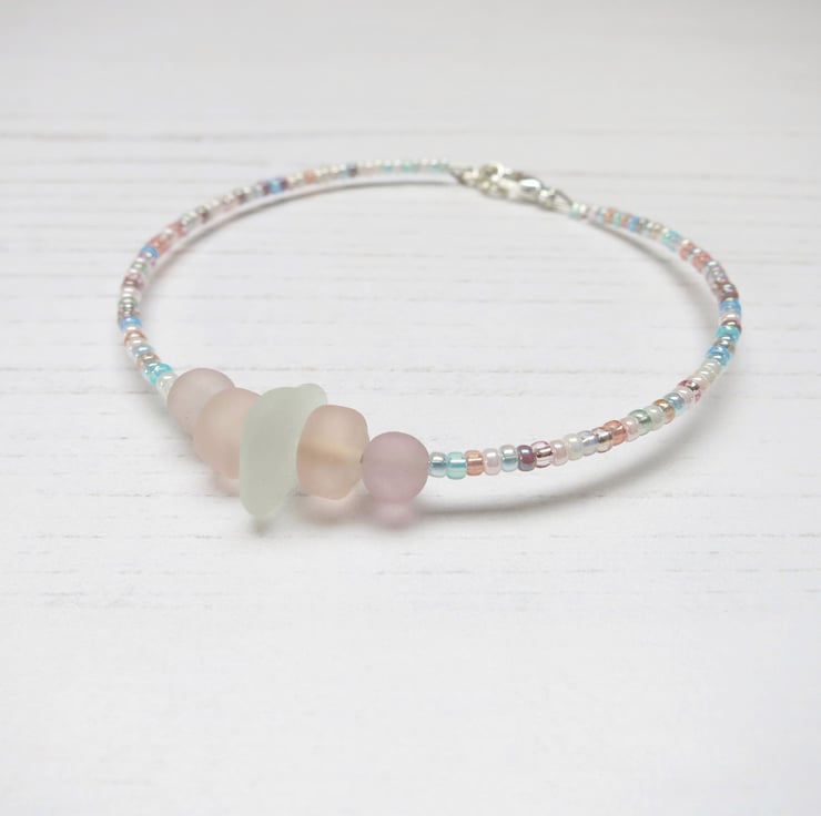 Simple style bracelet with white Cornish sea glass, peach and lilac frosted glass beads and a mix of pretty pastel coloured seed beads.