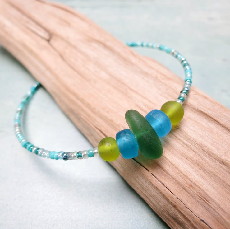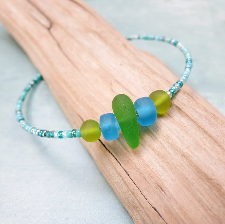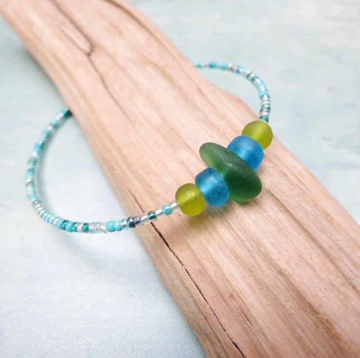 The sea glass and beads have been threaded on to memory wire which helps them retain a lovely bangle shape.