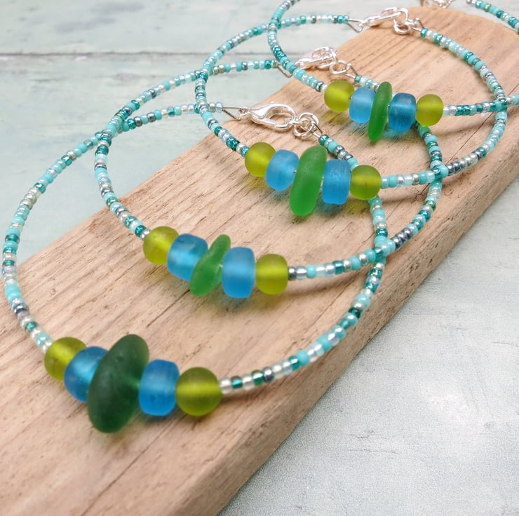 Although the design will be the same, each bracelet will vary slightly from the one in the photo as the shape and patina of these colourful little beach gems is down to the sea, making each one completely unique. I'm happy to send photos of ones that are available so you can choose, just pop me a message.
