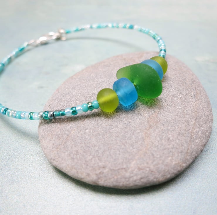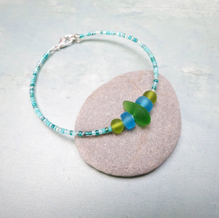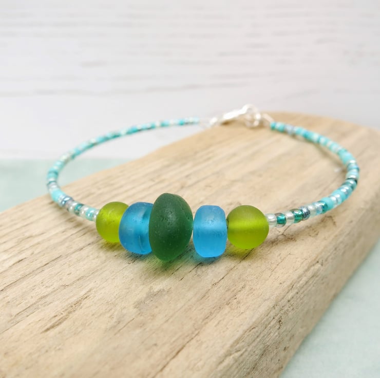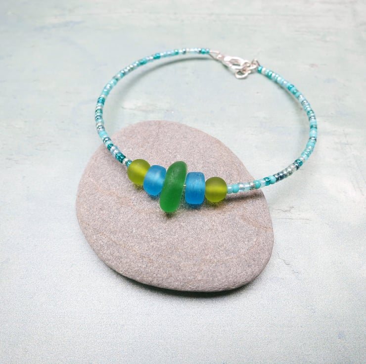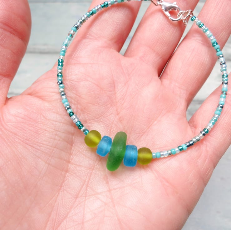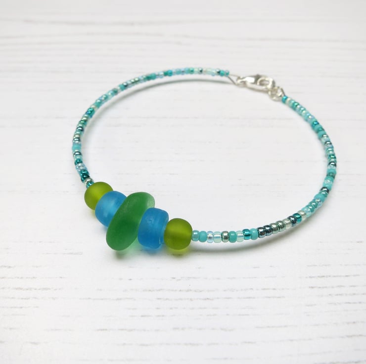 Simple style bracelet with green coloured Cornish sea glass, turquoise and lime green frosted glass beads and a mix of turquoise coloured seed beads.