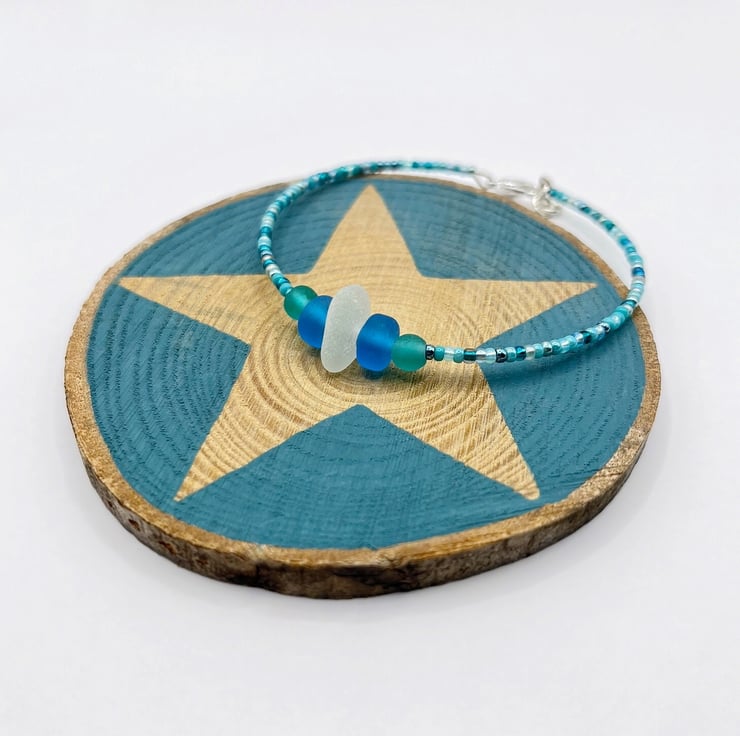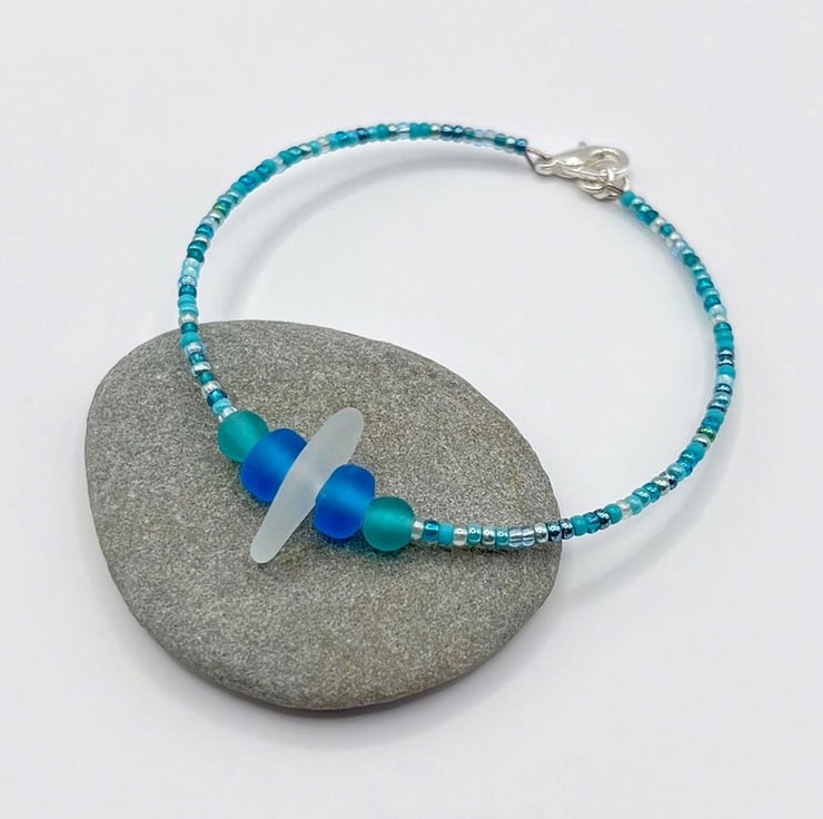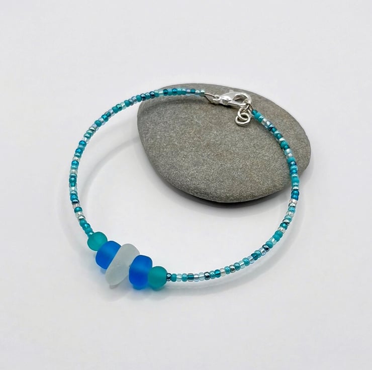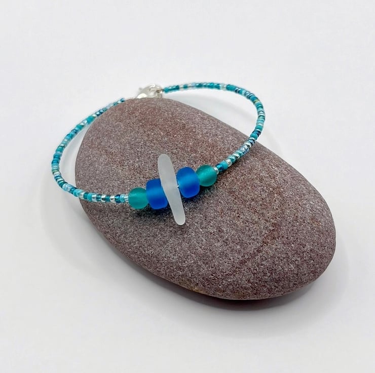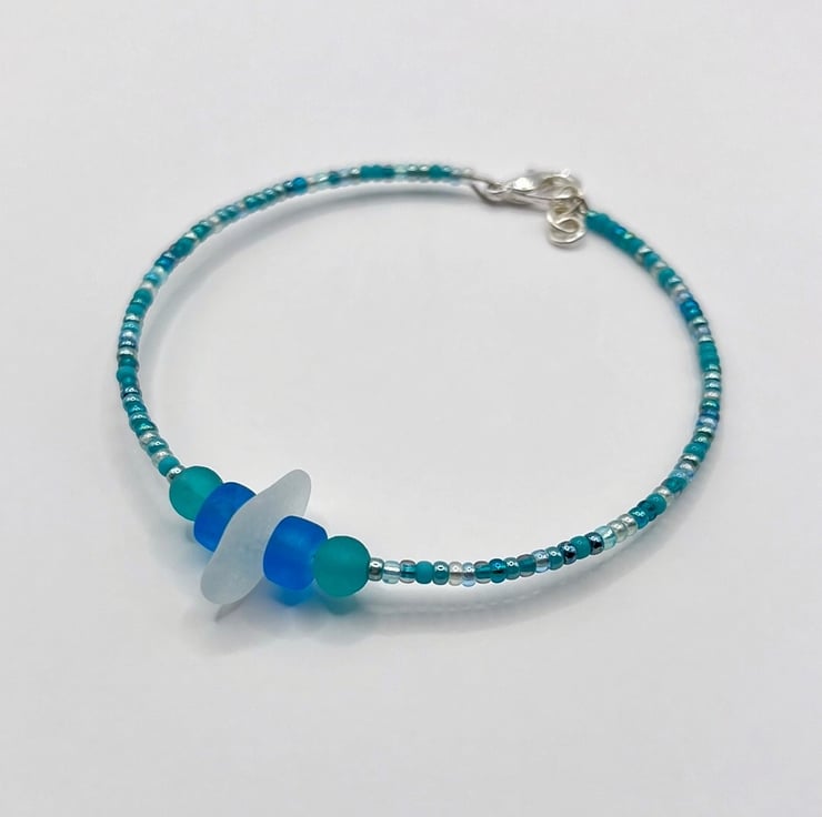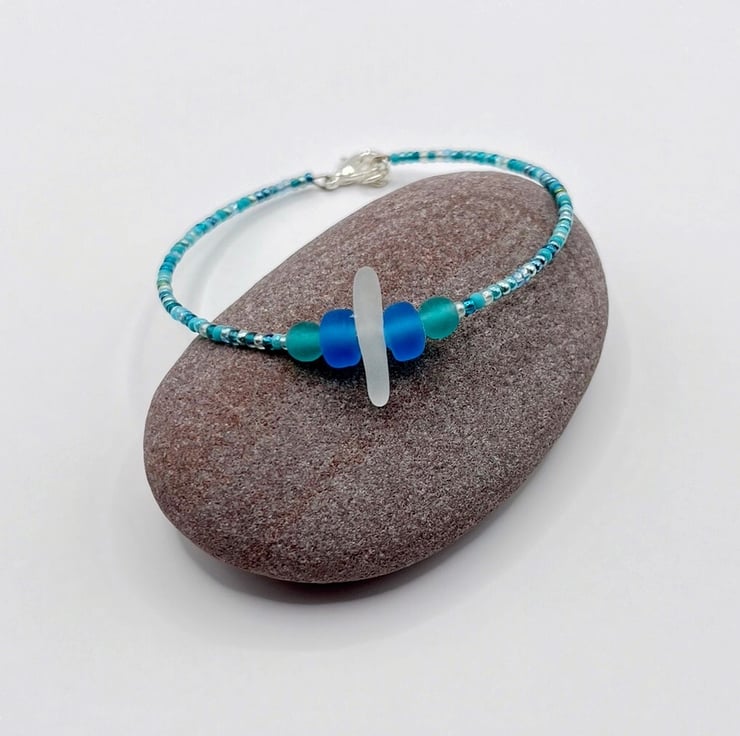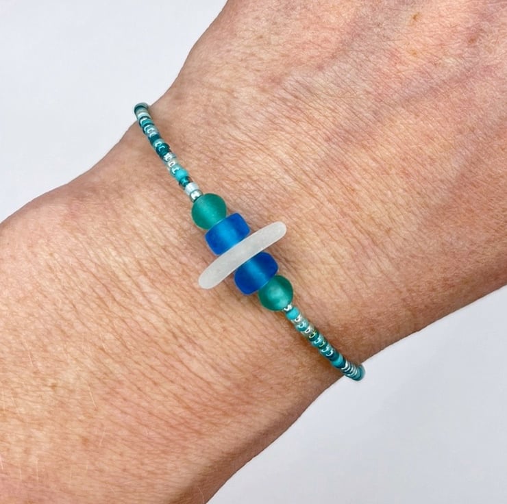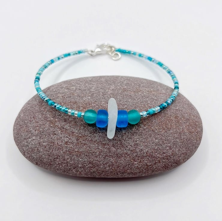 Simple style bracelet with white Cornish sea glass, sea green and blue frosted glass beads and a mix of turquoise coloured seed beads.