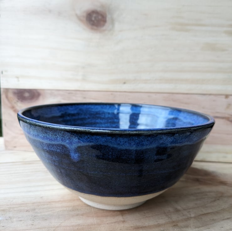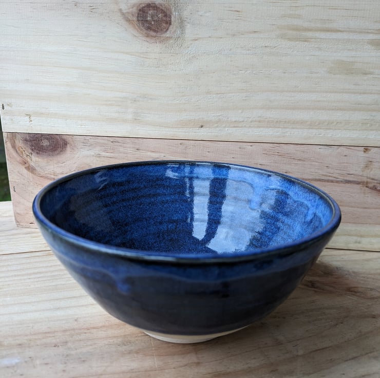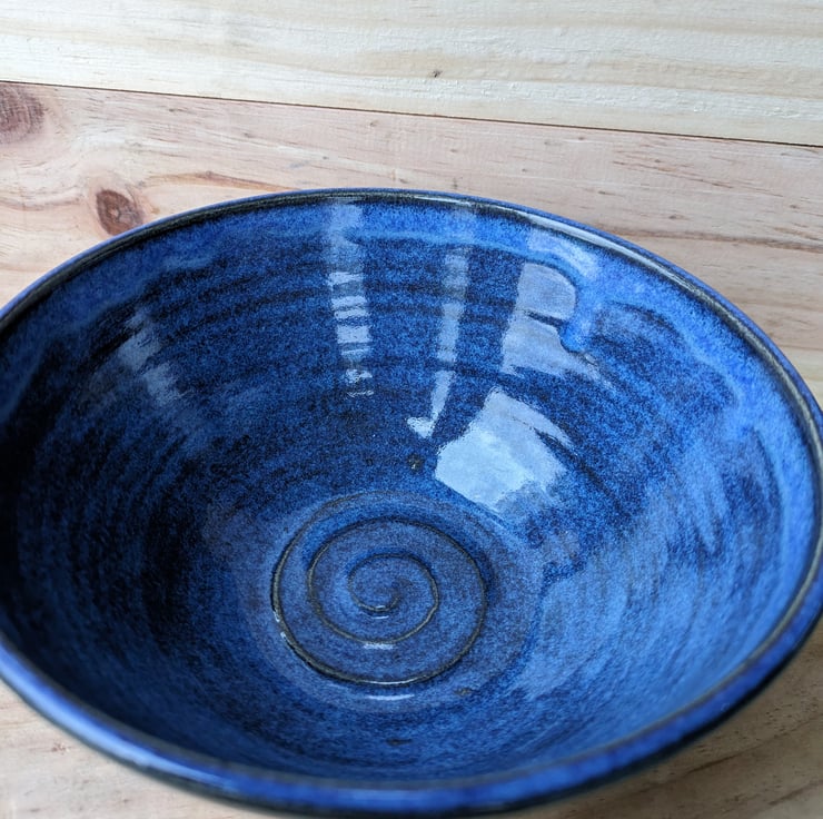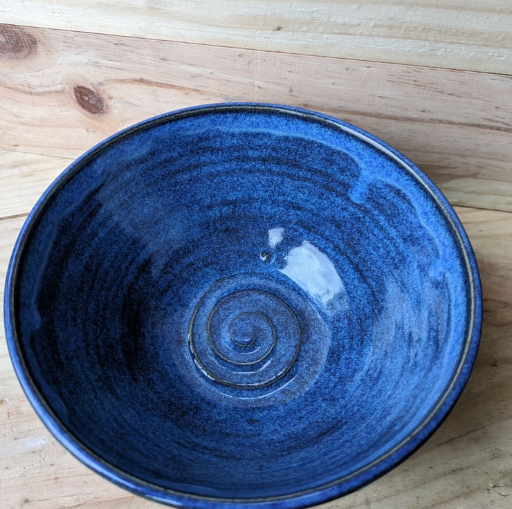 Medium sized blue bowl with a swirl in the base...great serving bowl for your snack of choice, chips for dip etc. Love the way the blue glaze floats a little, coming out differently on every piece. This is a slightly speckled stoneware clay and the glaze has come up a bit speckly too which is works for me! There are two of these, this one is ever so slightly bigger than the other one.
