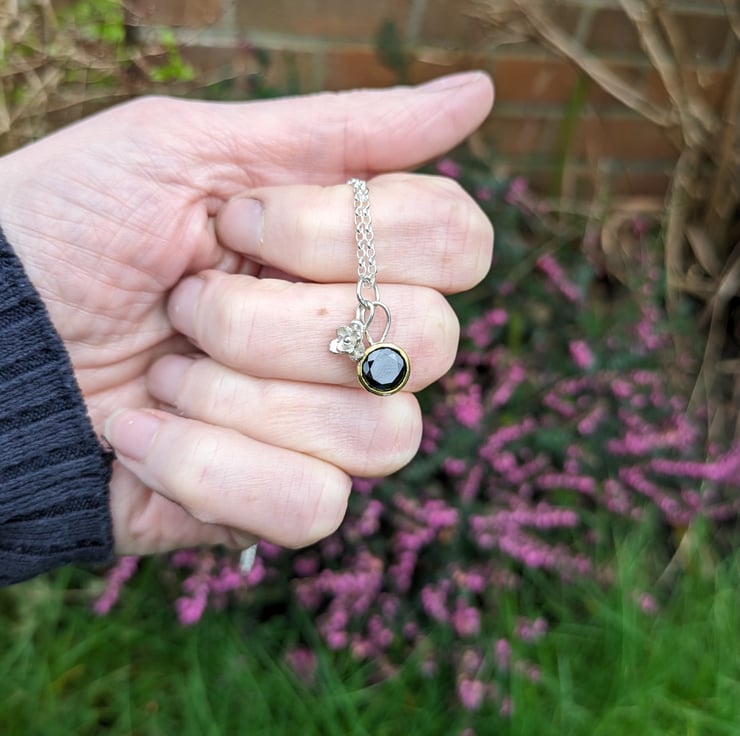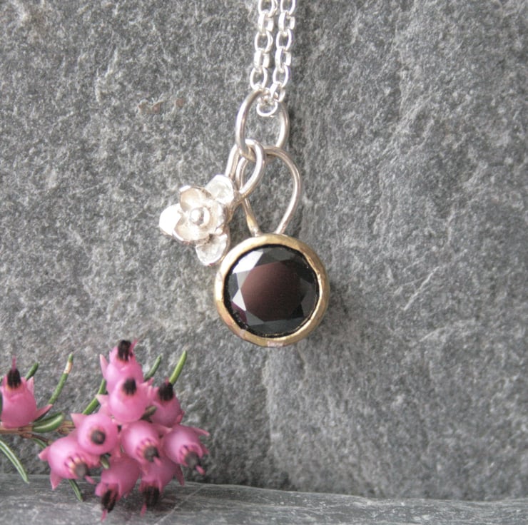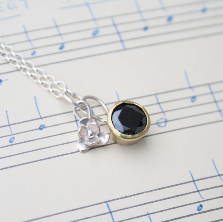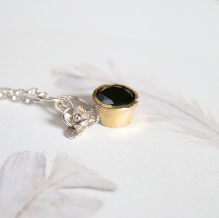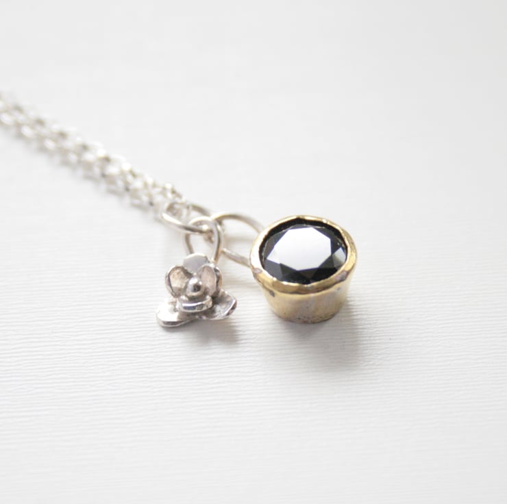 The flower charm is handmade from recycled sterling silver and the cubic zirconia is set within a handmade brass collet which is a tapered setting for the gemstone. These hang from a sterling silver chain, you can select the length of chain that you would like.