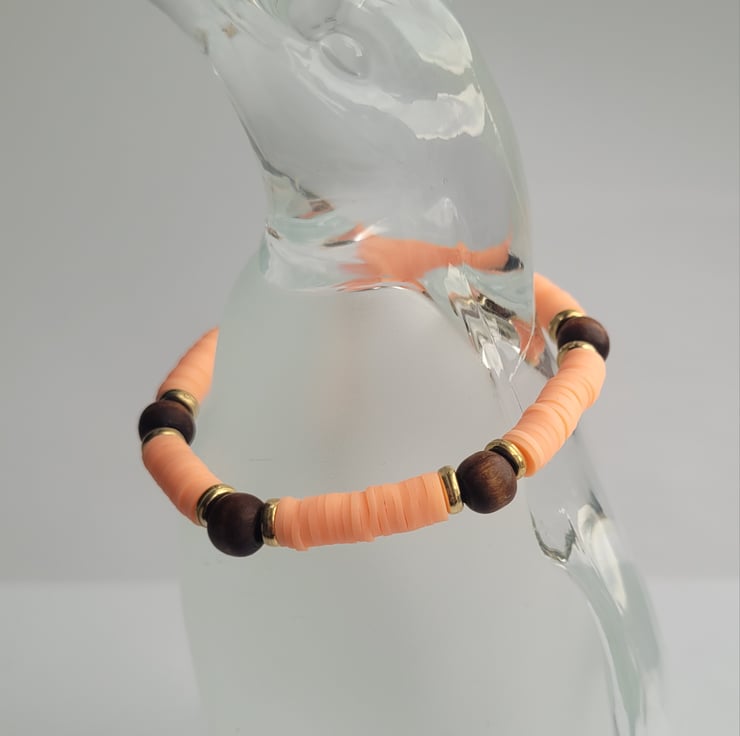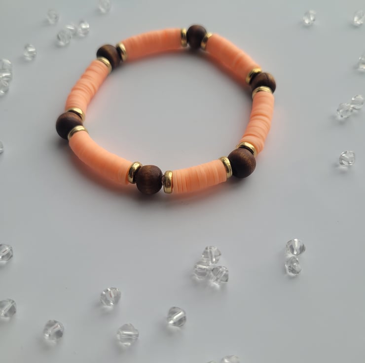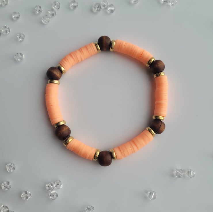 Unique handmade bracelet made from peach/apricot flat polymer clay beads, gold spacer beads, 6x wooden beads and clear elastic cord.