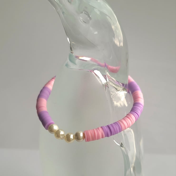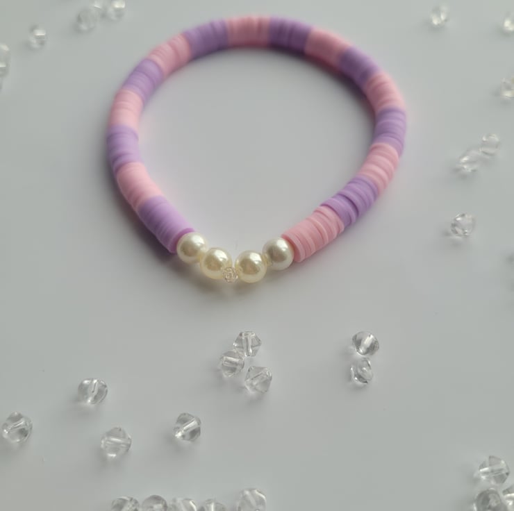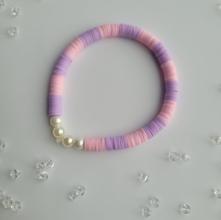 A unique handmade bracelet made from pastel pink and pastel lilac flat polymer clay beads, 4x white pearl beads and clear elastic cord.