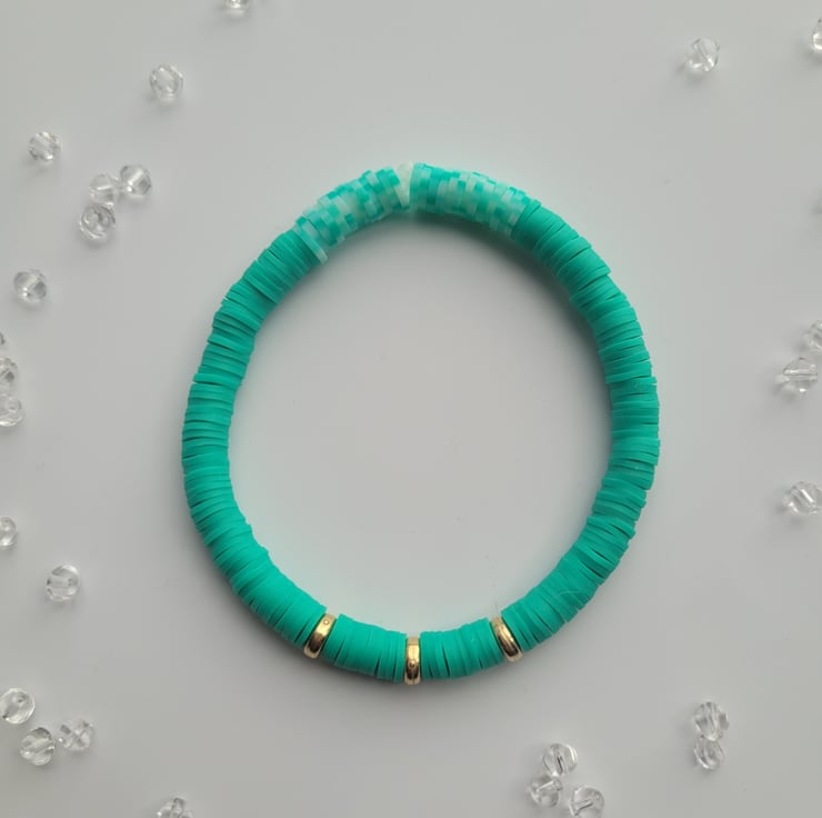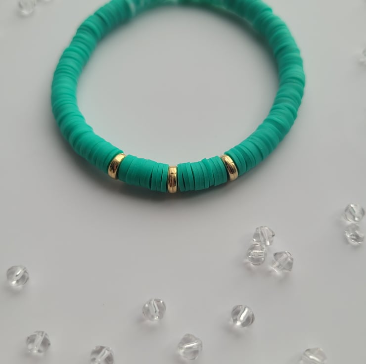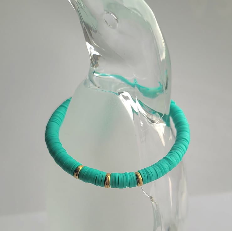 A unique handmade bracelet made from turquoise flat polymer clay beads, gold spacer beads and clear elastic cord.