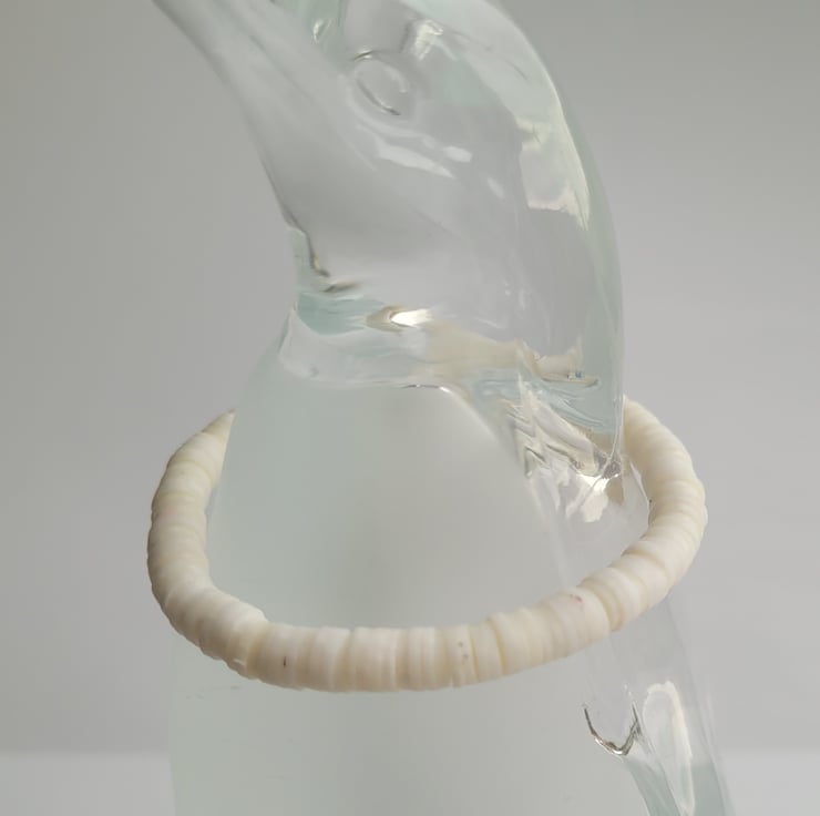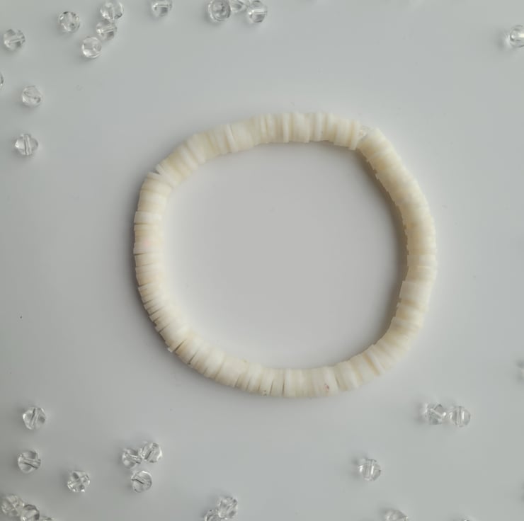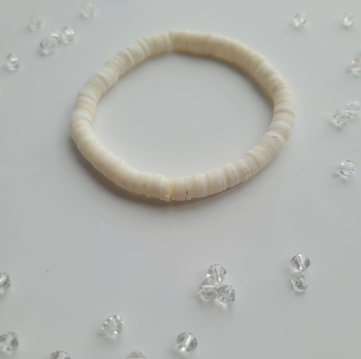 A handmade bracelet made from white flat polymer clay beads and clear elastic cord.