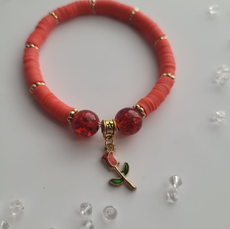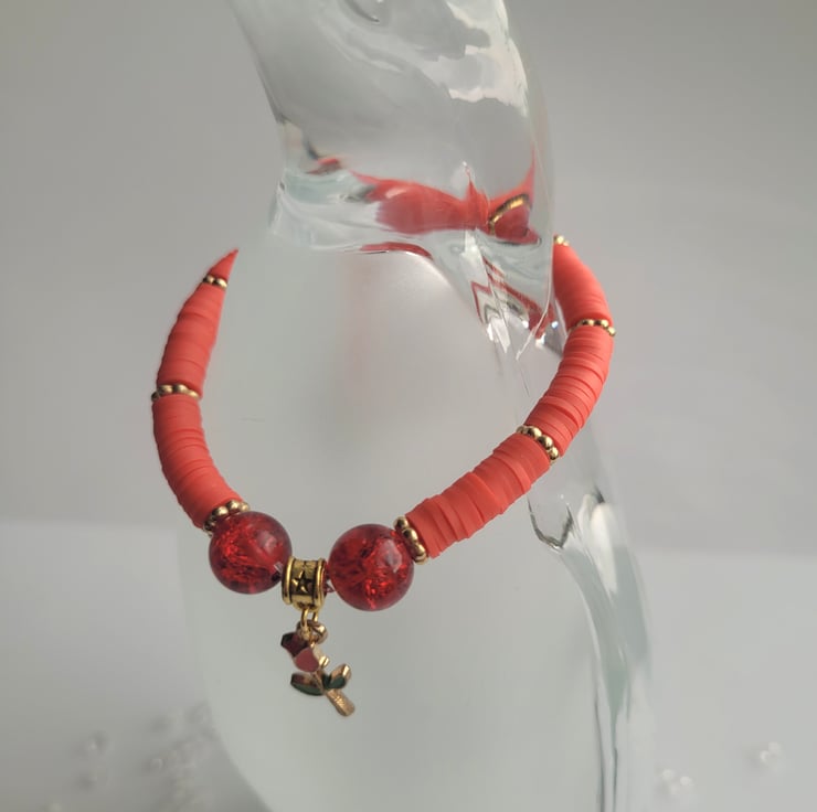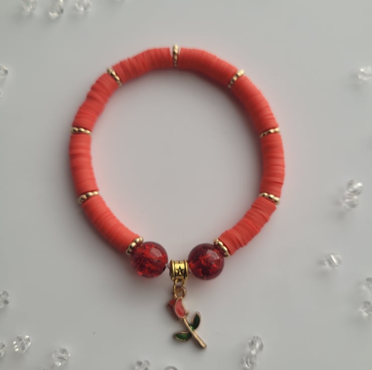 A beautiful and unique handmade bracelet made from red flat polymer clay beads, gold spacer beads, 2x red beads, rose charm and clear elastic cord.