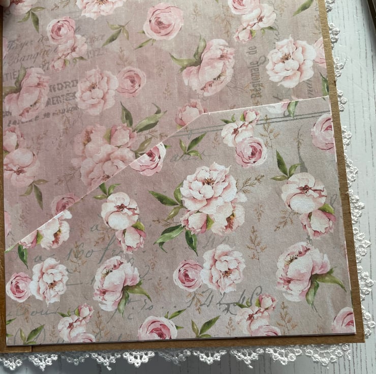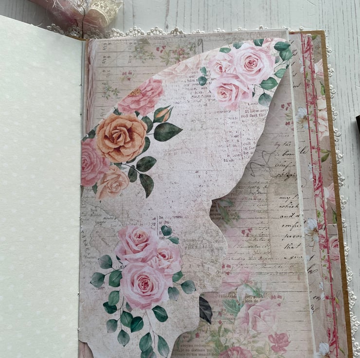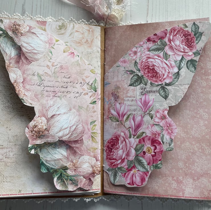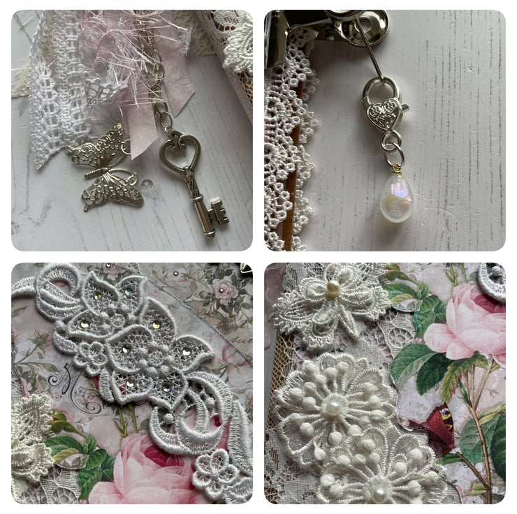 Butterfly journal with floral pages and butterfly handcut shaped pages. Front cover is decorated with lace, appliqués , silver page edgers and diamantés. Lace, chain and key charm and butterfly charm dangle on a bulb pin on the spine. Held shut with a bull dog clip with a heart clip and pearl bead.