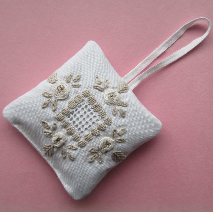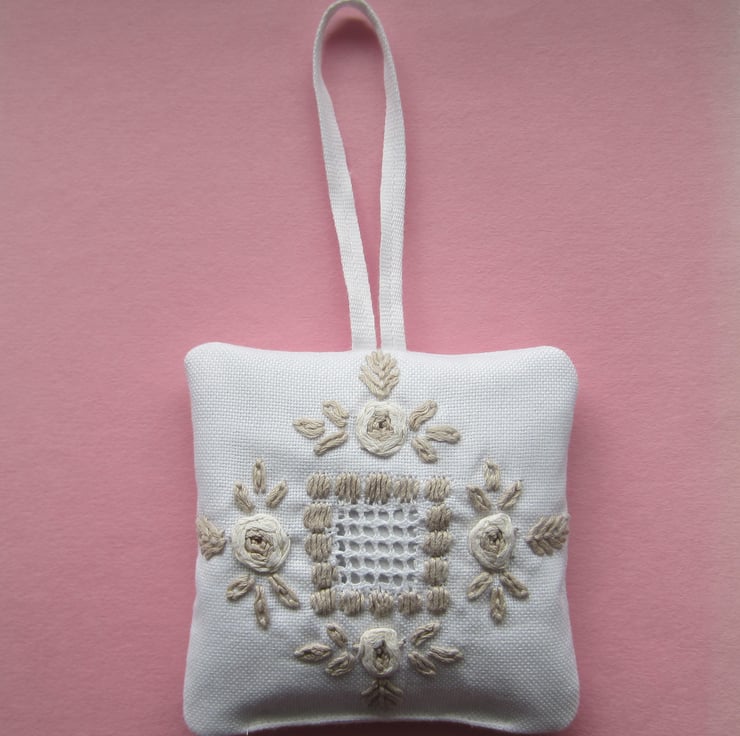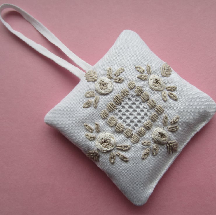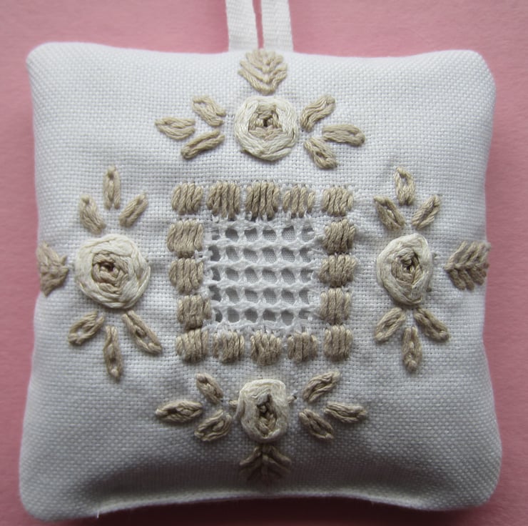 Lavender bag or sachet with a vintage embroidered flower design in fawn and cream colours on a white background. The back and hanging loop are white.