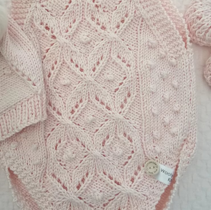 Bonnet has bobble pattern and luxury pom poms added has knitted ties to fasten under the chin.