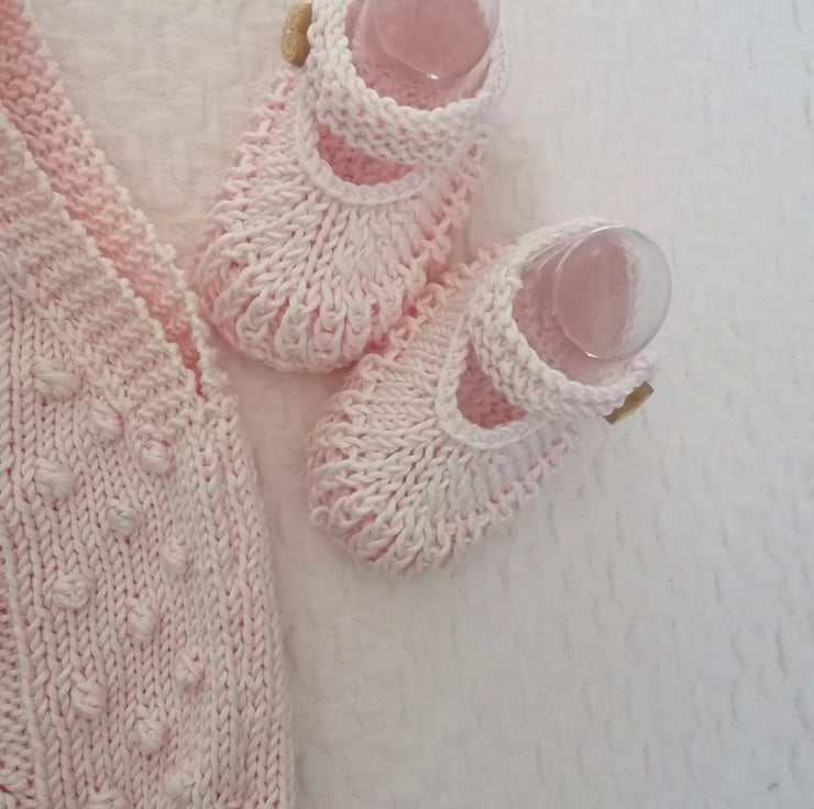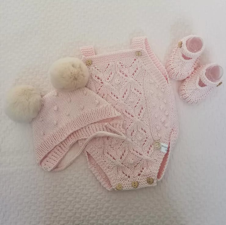 This 3 piece baby outfit comprises of romper, bonnet and tiny shoes.