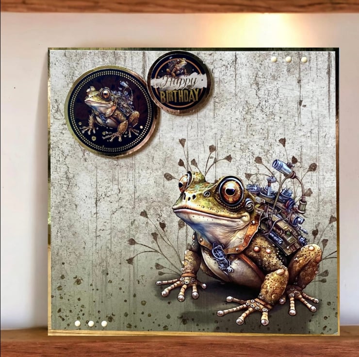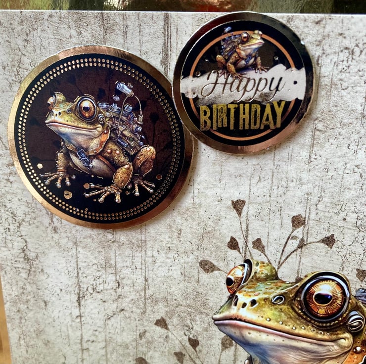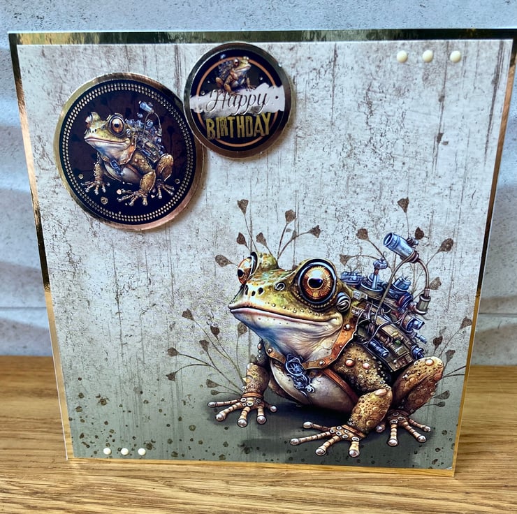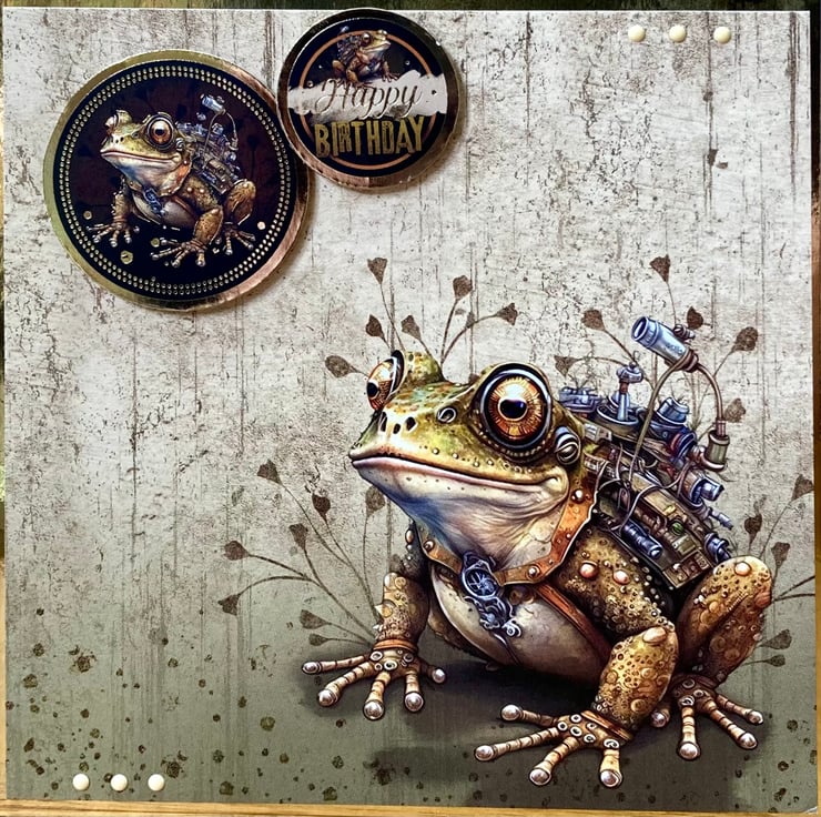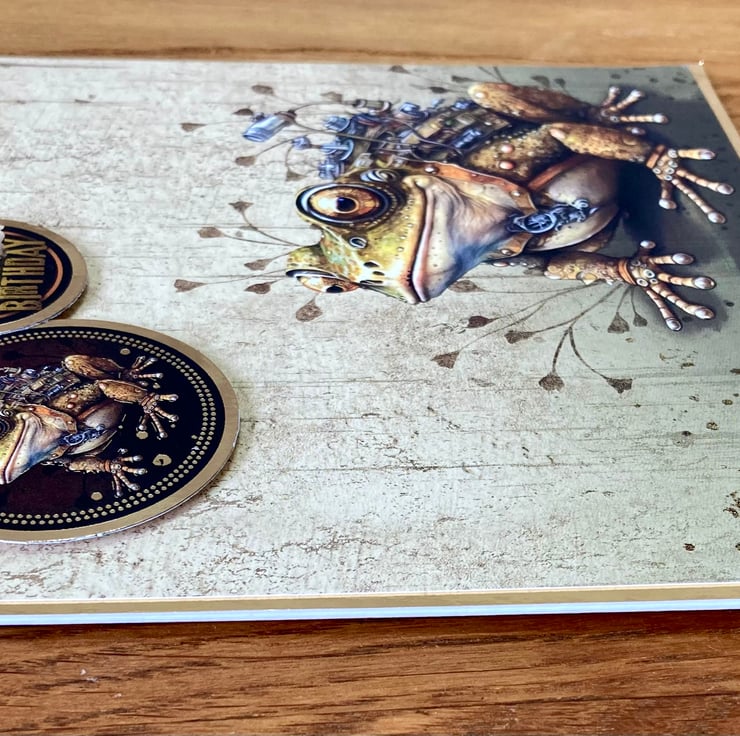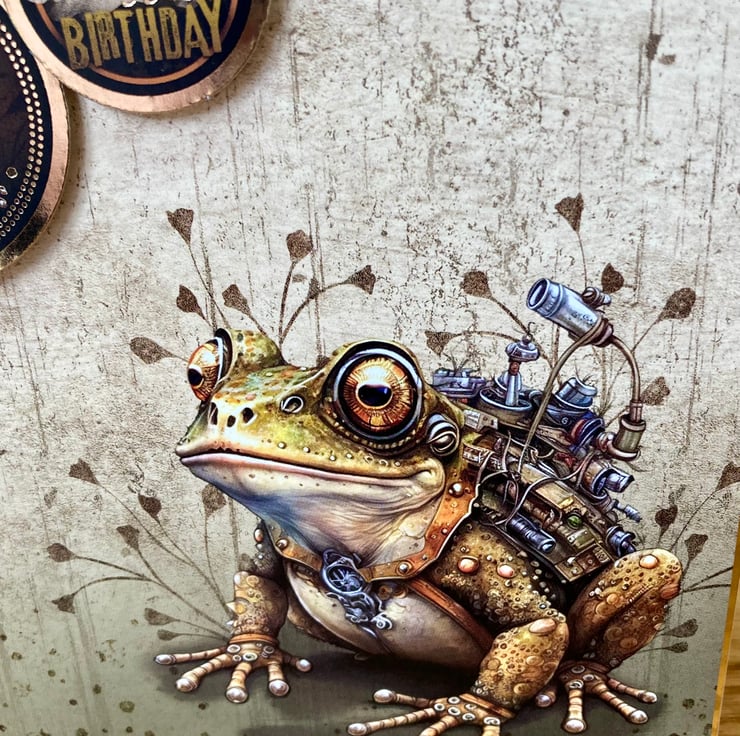 This steampunk-inspired frog birthday card is a delightful fusion of fantasy and industrial design.
