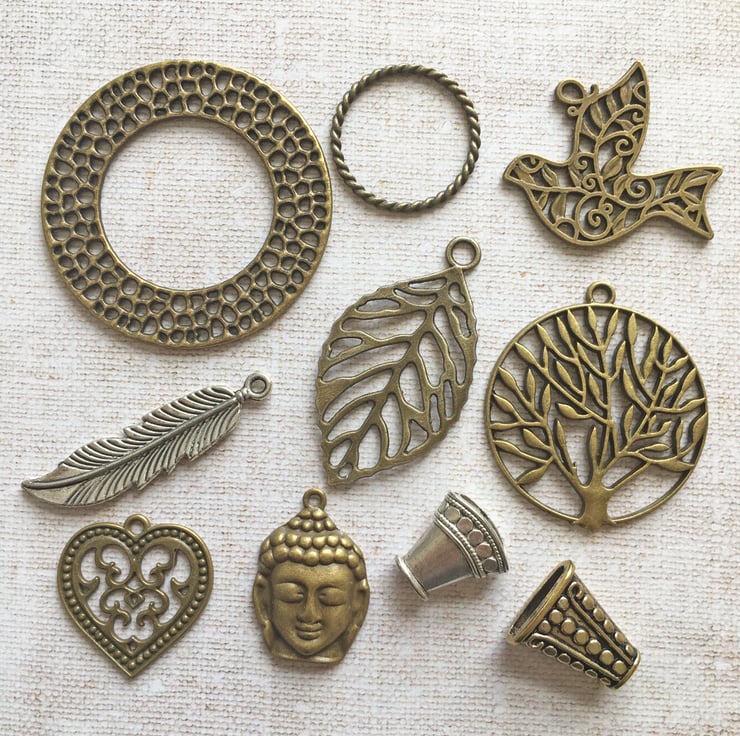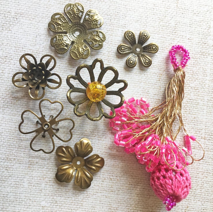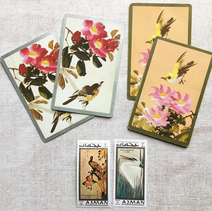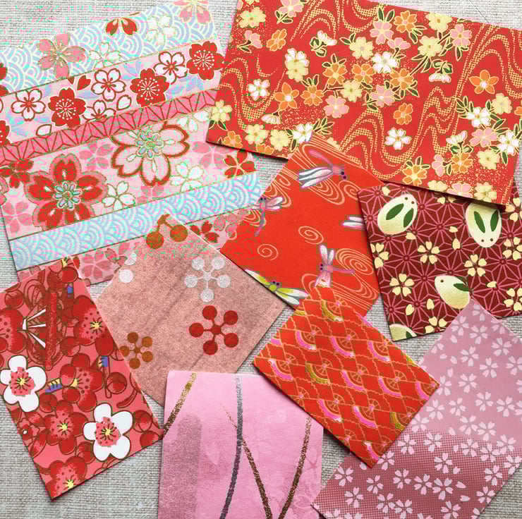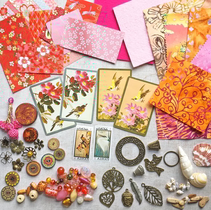 I've raided my supplies and put together a colourful, bargain bundle of items. There's a selection of origami papers, vintage playing cards and postage stamps, charms, beads, shells, wooden buttons, bead caps, batik fabric and more.