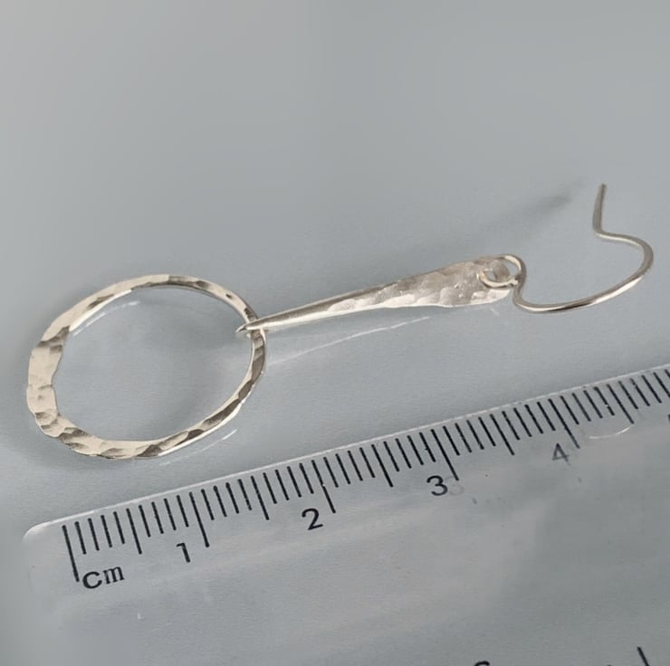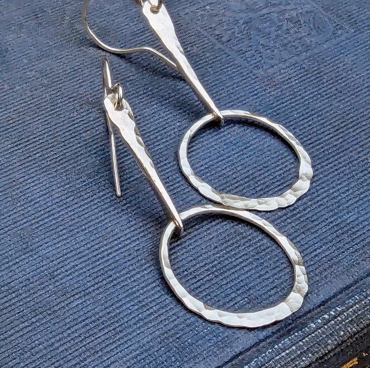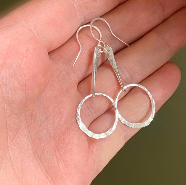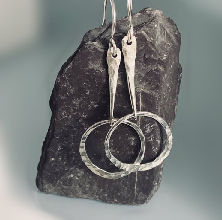 Hammered and forged bars and Hoops hanging from handmade earwigs.