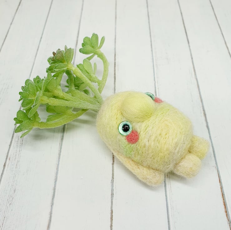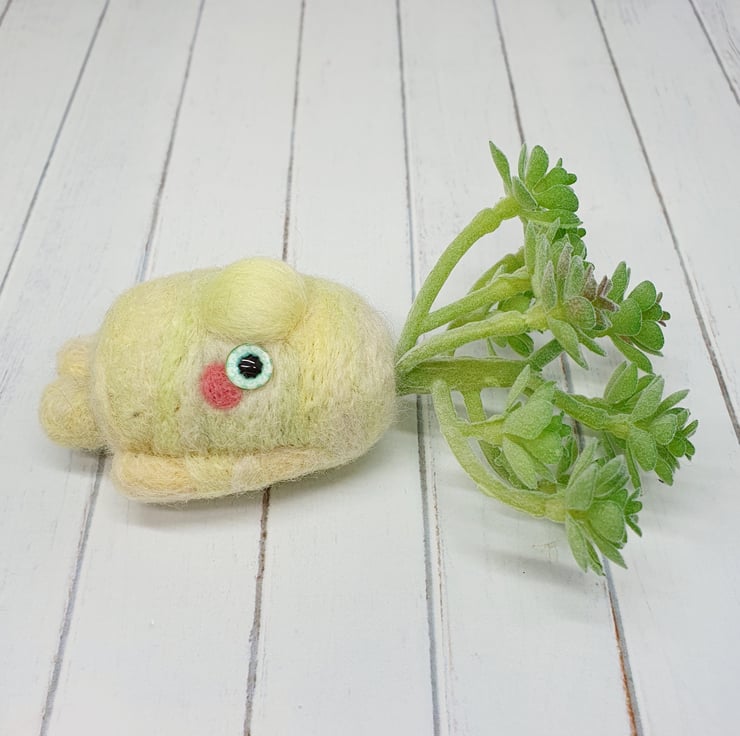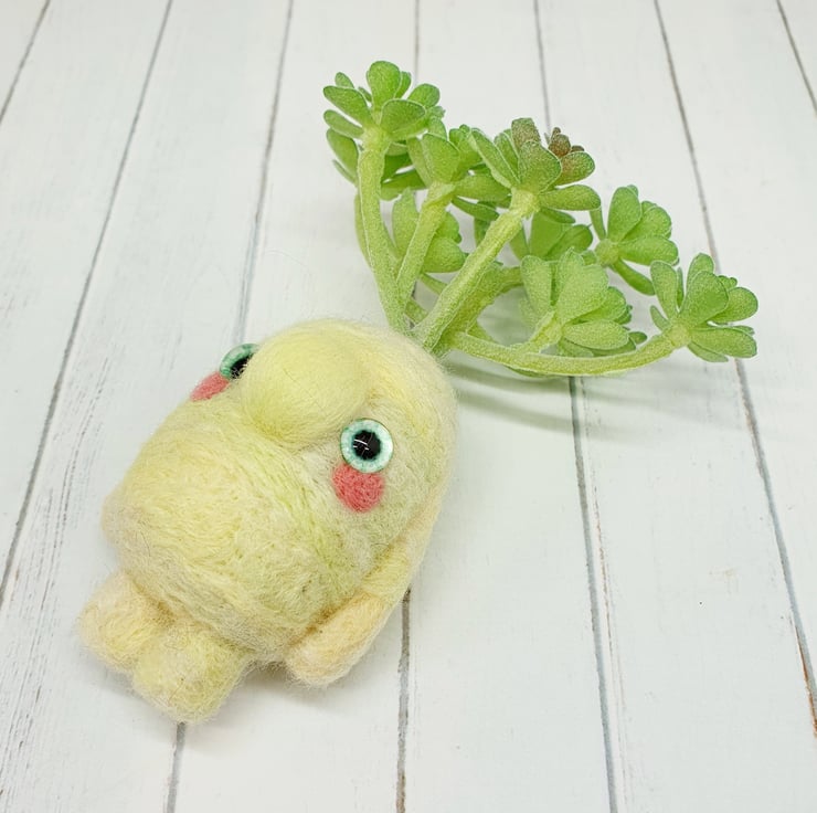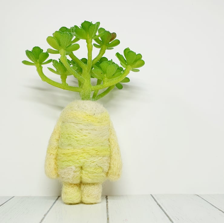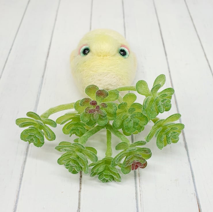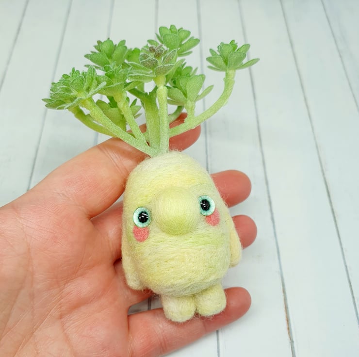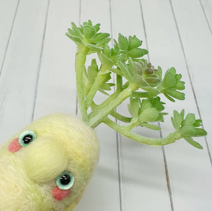 Decorative gnome doll needlefelted with hand dyed wool. This little cutie measures roughly 12cm tall and has pretty glass eyes and faux Succulent plant atop it's head. This doll cannot stand unaided and needs to lean. This unique doll is made for decorative purposes only and not a toy.