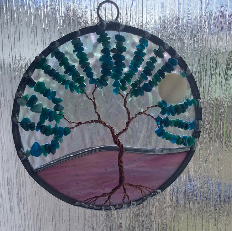 The background has an irridised textured clear glass with a purple and white mix base that have been foiled and soldered together . There is a twisted copper wire tree with branches filled with amazonite and apatite gem chips and the panel is edged with a traditional lead came channel.