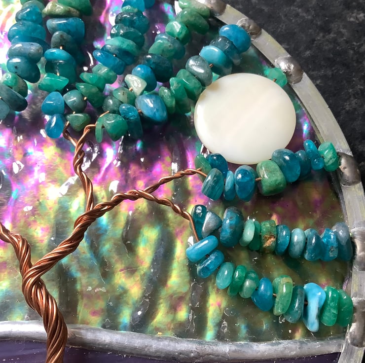 An amazonite and apatite tree of life decoration that works as a suncatcher or wall hanging.