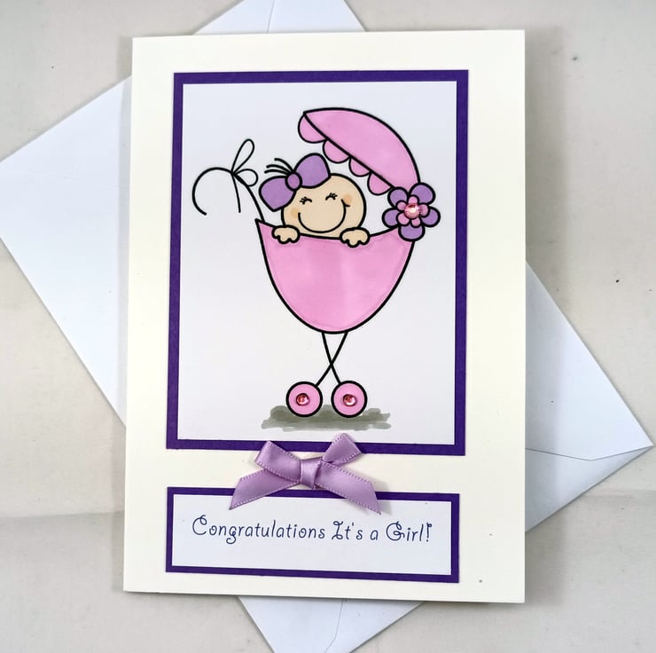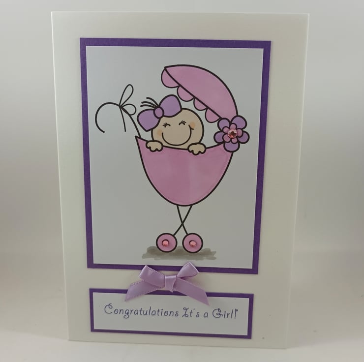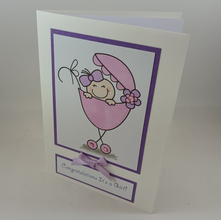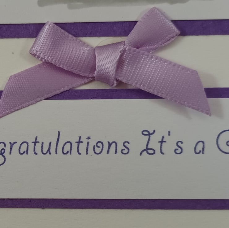 The sentiment reads:' Congratulations It's a Girl!' and together with the image is mounted on purple card. The card is embellished with a lilac satin ribbon bow.