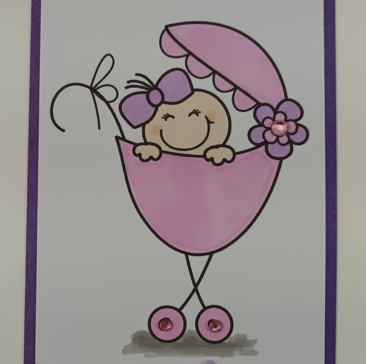 A6 card featuring a hand coloured image of a cute baby in a pram. The flower on the pram and the wheels have been embellished with coloured gems.