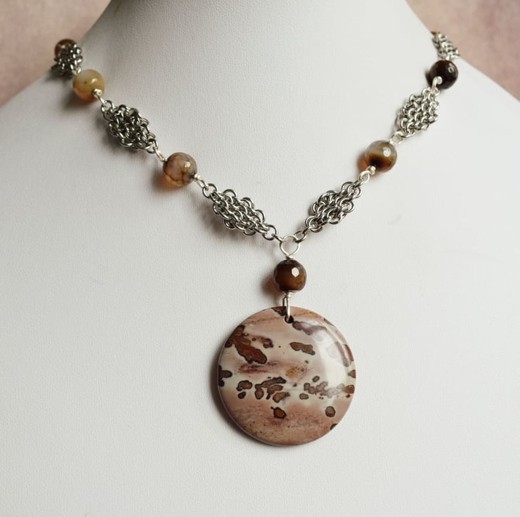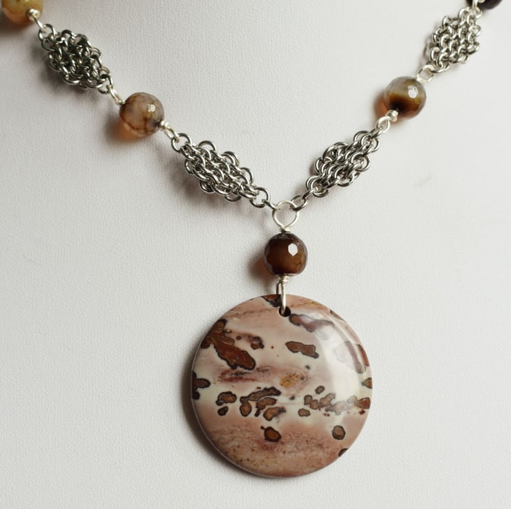 I have used a round jasper pendant and paired it with dyed brown agate beads. The beads vary in colour from almost translucent to deep chocolate brown and they are faceted so they catch the light as you move.