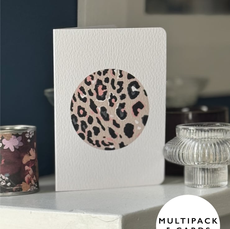 Birthday card alert! This is a lovely blank card multipack selection box of five (5) A6 cards with one design: Leopard Print Circle.