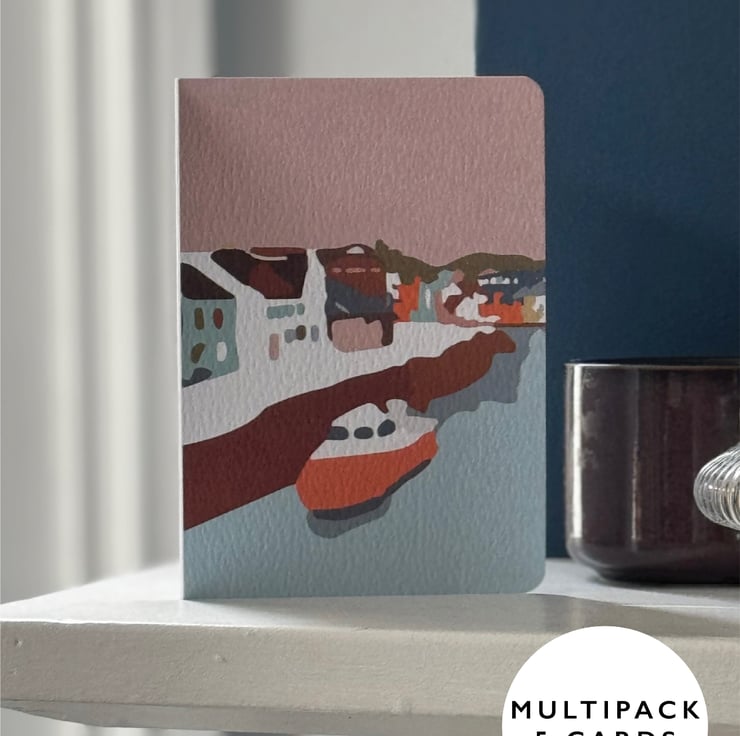 This is a lovely blank card multipack selection box of five (5) A6 cards with one design: new beginnings boat card.