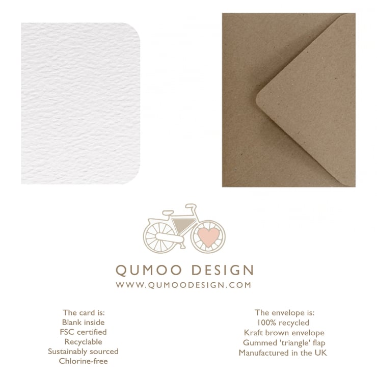 Paper Sizes: The cards are A6, portrait (105mm wide x 148mm height) and printed on a single side, (the inside is blank), it is printed on hammered (textured) paper and is supplied with a BROWN KRAFT envelope, the recycled paper used in the envelopes are made from 100% post consumer waste.