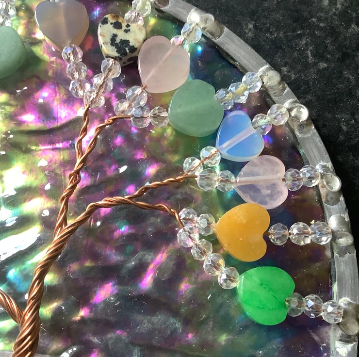 A mixed gemstone heart tree of life decoration that works as a suncatcher or wall hanging.