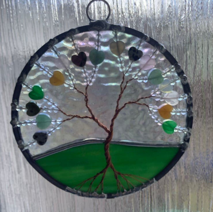 The background has an irridised textured clear glass with a green mix base that have been foiled and soldered together . There is a twisted copper wire tree with branches filled with mixed gemstone hearts and the panel is edged with a traditional lead came channel.