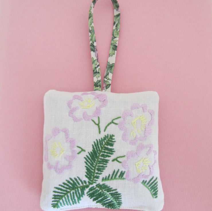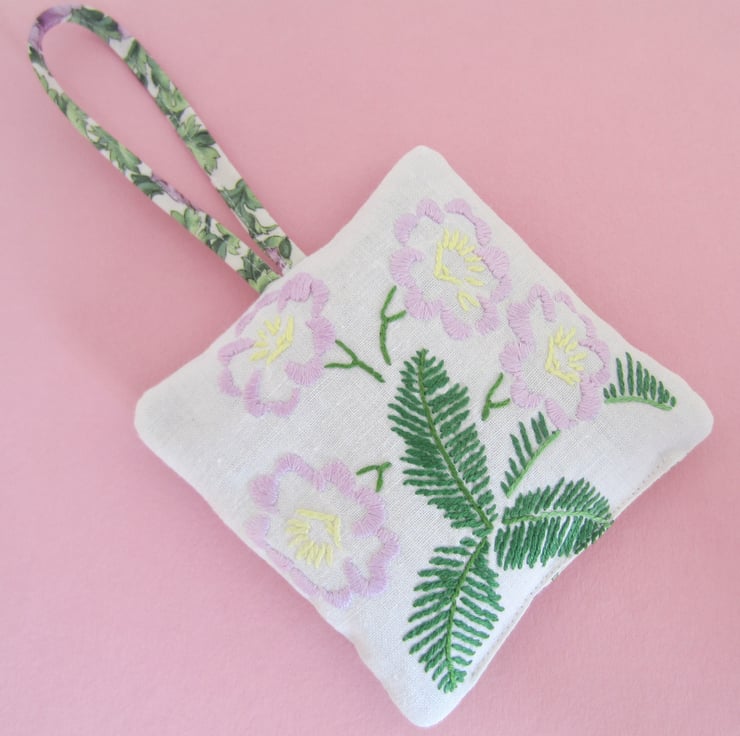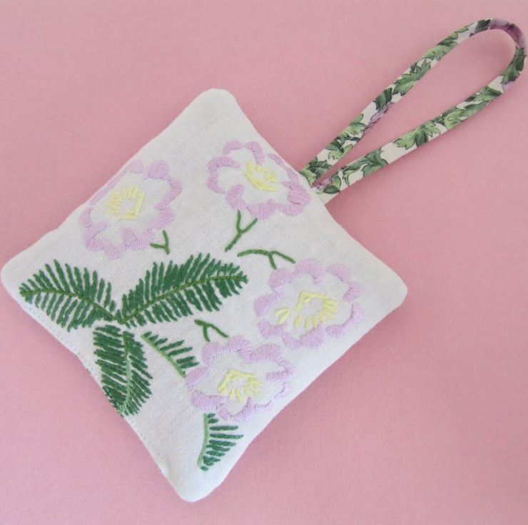 Lavender bag or sachet made with a piece of vintage embroidered floral fabric. It is backed with a coordinating green and mauve floral fabric. The hanging loop is made in the same fabric.