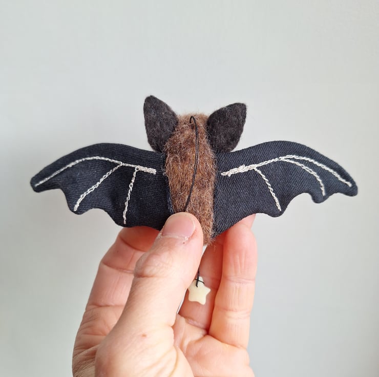 Each little Bat is uniquely handmade, and features tiny black glass eyes, a dinky glow in the dark star, and poseable wings. I sew each Bat wing on my vintage singer sewing machine, stitching details with contrasting cream thread against the black denim.