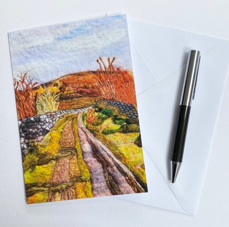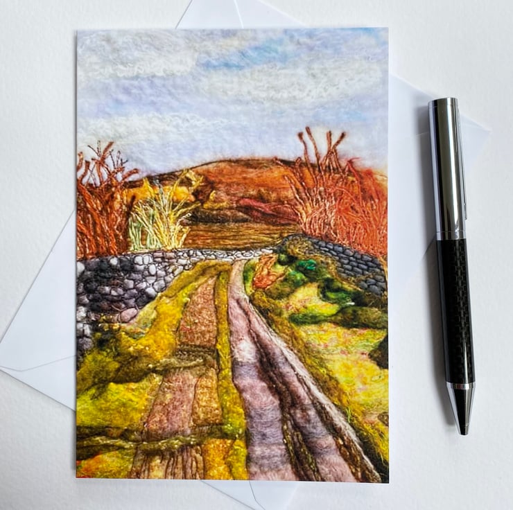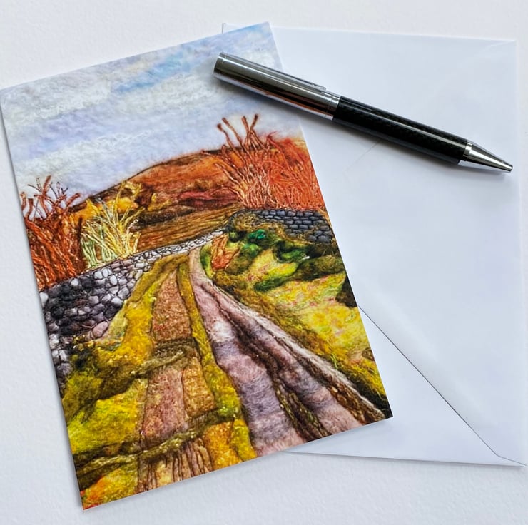 This card is a print of one of my free motion embroidered wet felted pieces. It shows moorland in the distance down a muddy track. It’s blank inside making it ideal for any occasion. The card measures 12.5 x 18cm and it comes with an envelop in a plastic cover for protection.
