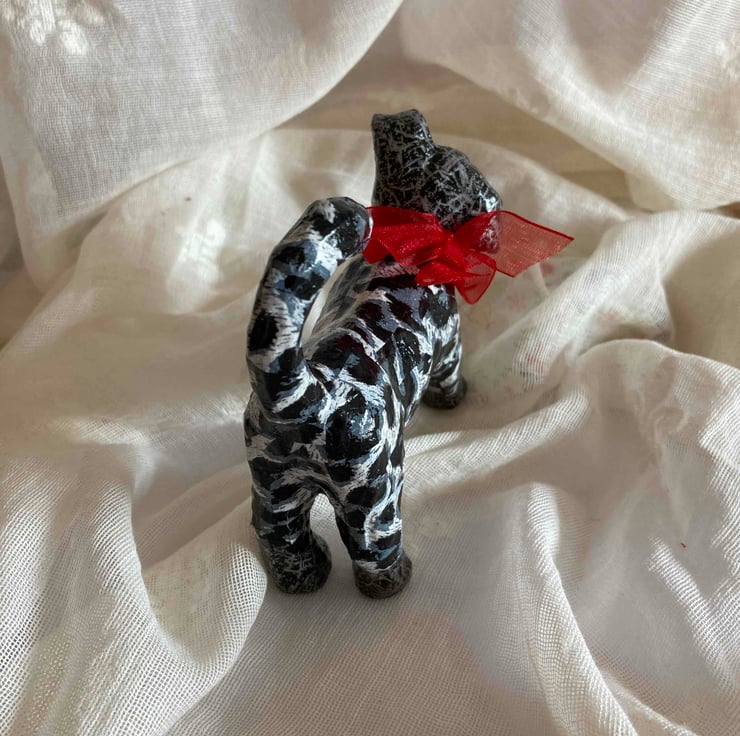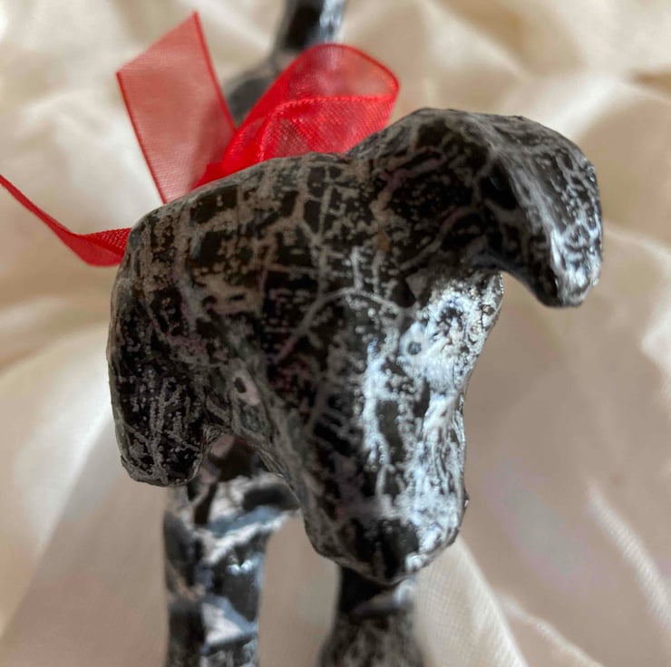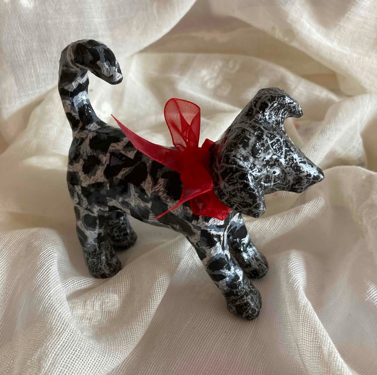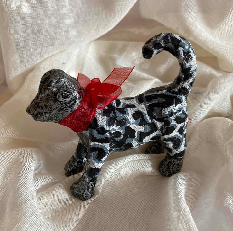 This dog is decorated in black, grey, silver and white coloured papers. The dog is made of papier mache and Decopatched and finally varnished.