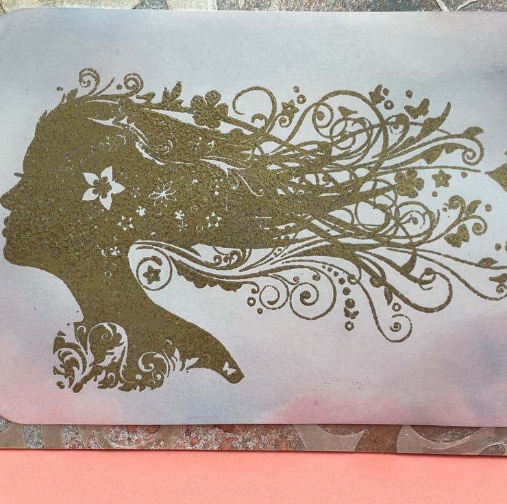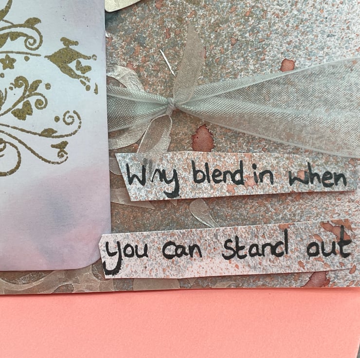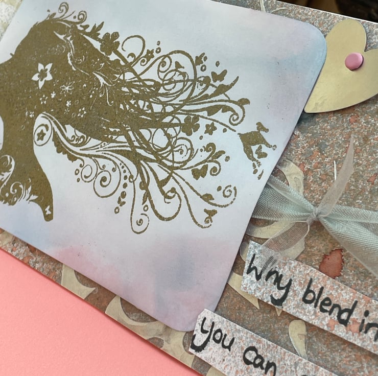 A unique and beautiful card. This DL sized card features a sprayed and stenciled abstract background in pale blues, gold and pink. This is topped with a pale blue organza ribbon across the middle. The main design is a silhouette stamped an embossed in gold of a woman's head with her hair flowing behind her. This is swirling and has flowers and butterflies in it. The design is finished with a metal heart and the sentiment Why blend in when you can stand out. Inside the card is blank for your own greeting. A very versatile design for many occasions.