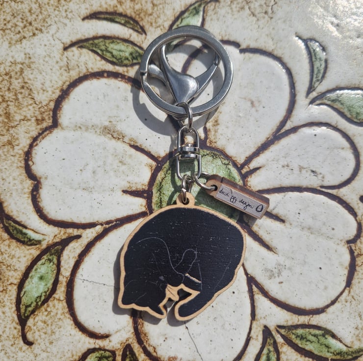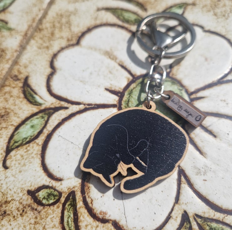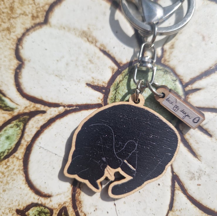 Black cat keyring based on my cat Cocoa. Illustrated by me and made in the UK using FSC certified wood.