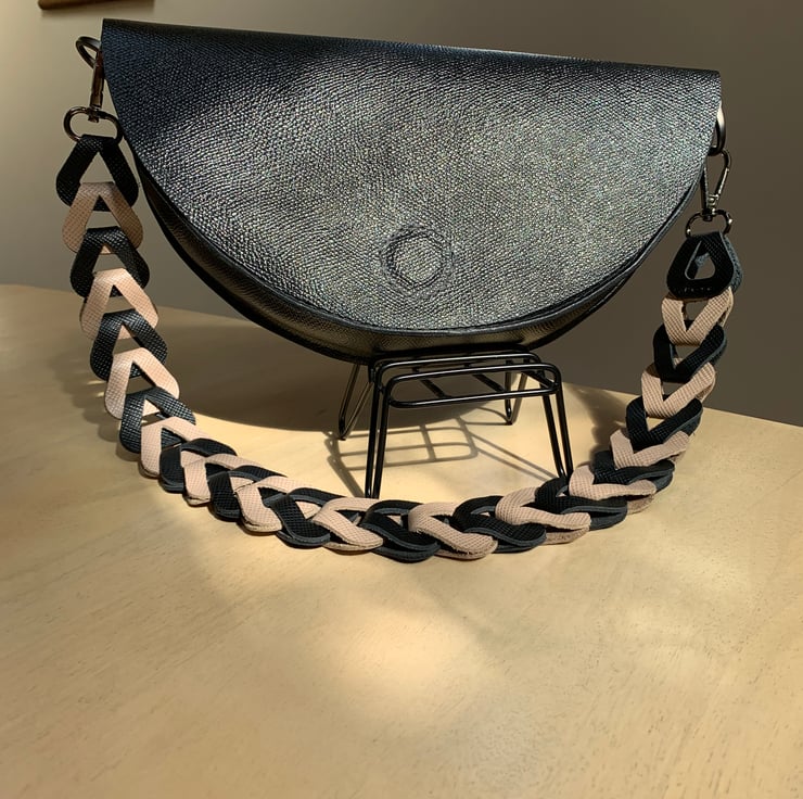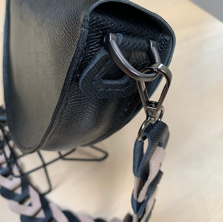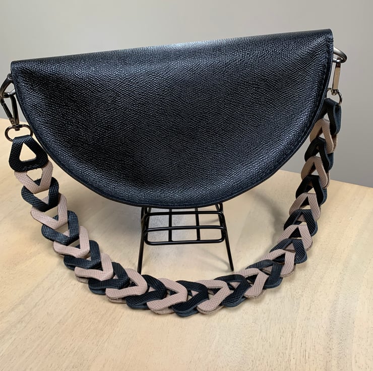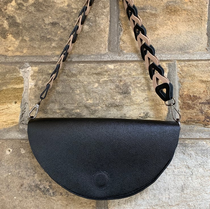 Handmade black leather bag in a half moon shape is perfect for that special event or wear it with a tailored suit. It’s so chic and versatile you can dress it up or down.