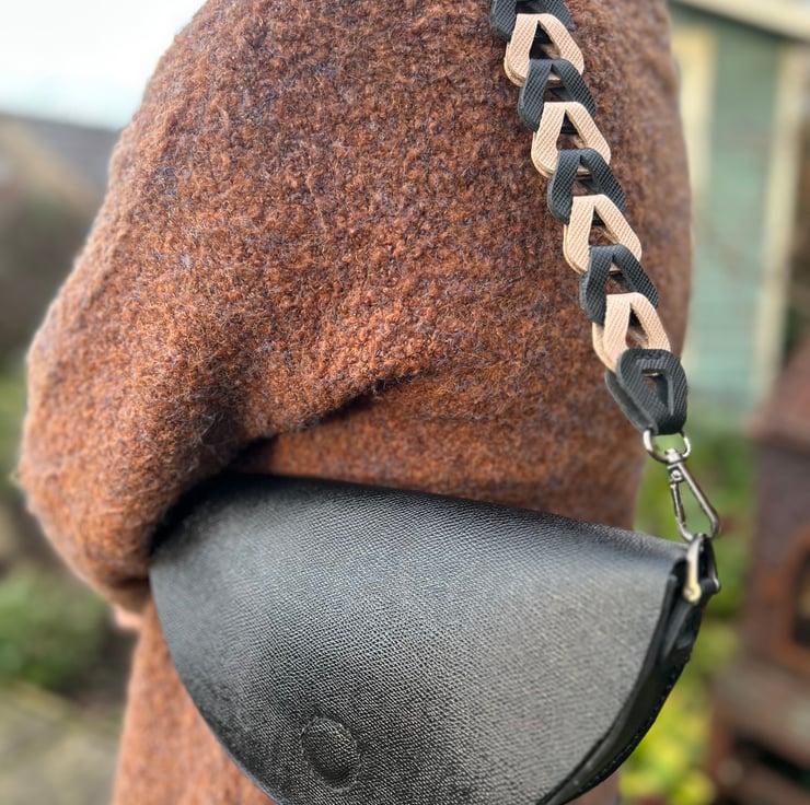 Featuring a shoulder/hand carry leather link strap made in 2 contrasting colours of black and stone it can be detached so you can use the bag as a clutch.