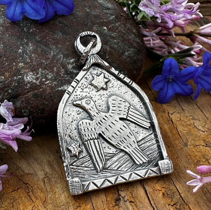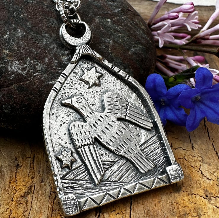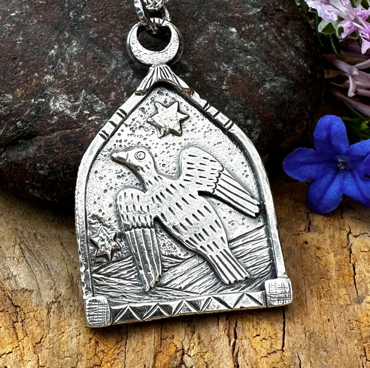 Made using traditional jewellery making techniques, in sterling silver. Using a piercing saw, hand engravers, metal stamps, hammers, filing, soldering and polishing! With an oxidised finish to highlight detail.