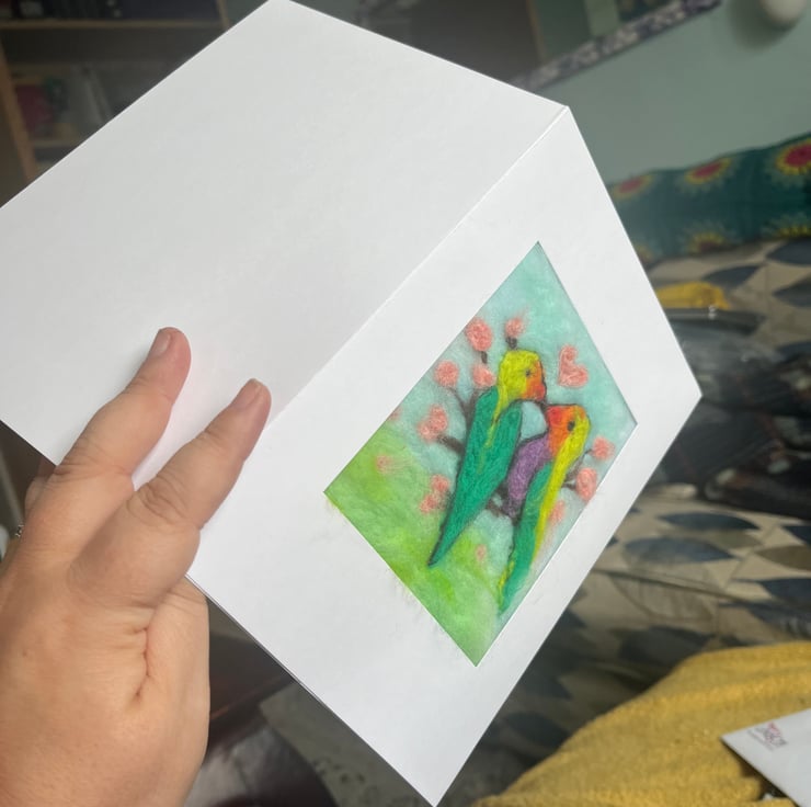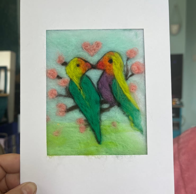 An A5 greetings cards with handmade, unique love birds and cherry blossom wool painting. Can be used as a wall hanging as well as card.