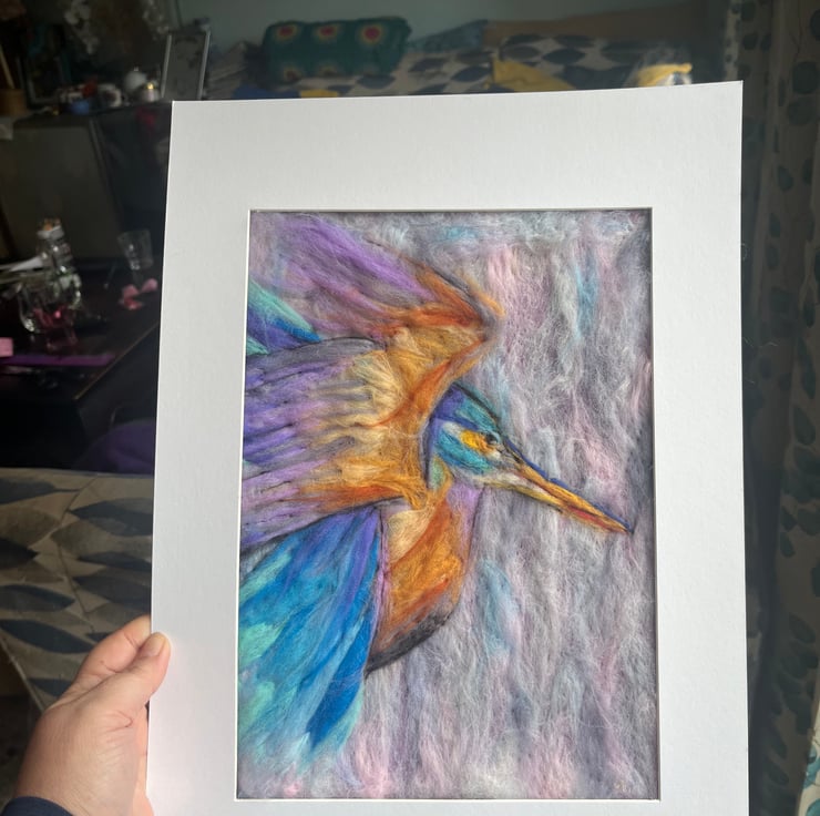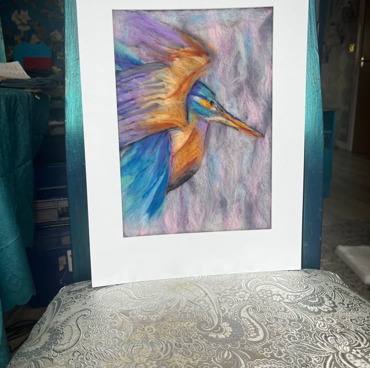 A4 in A3 mount painting of Kingfisher mid flight against pastel background.